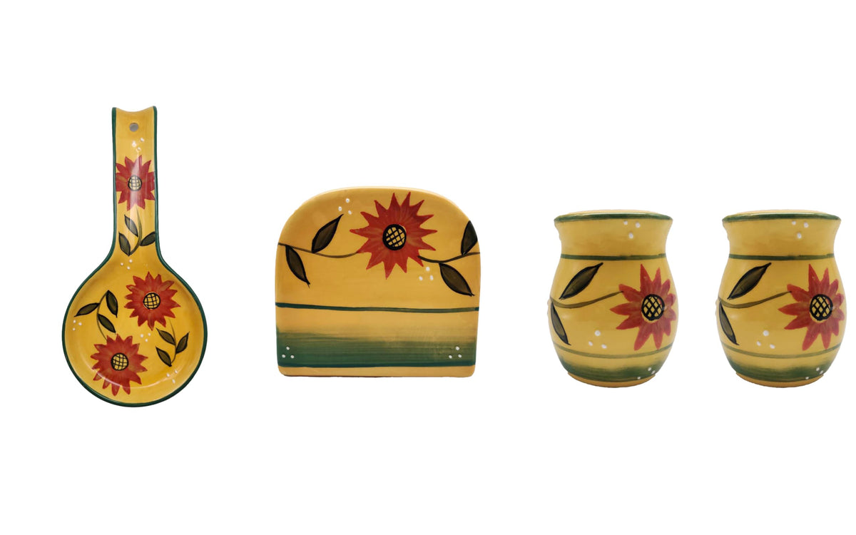 Ack Tuscany Country Sunflower Hand Painted Ceramic 4Pcs Table/Stove Top Set,Pepper/Salt Shakers,Napkin Holder And Spoon Rest,Kit