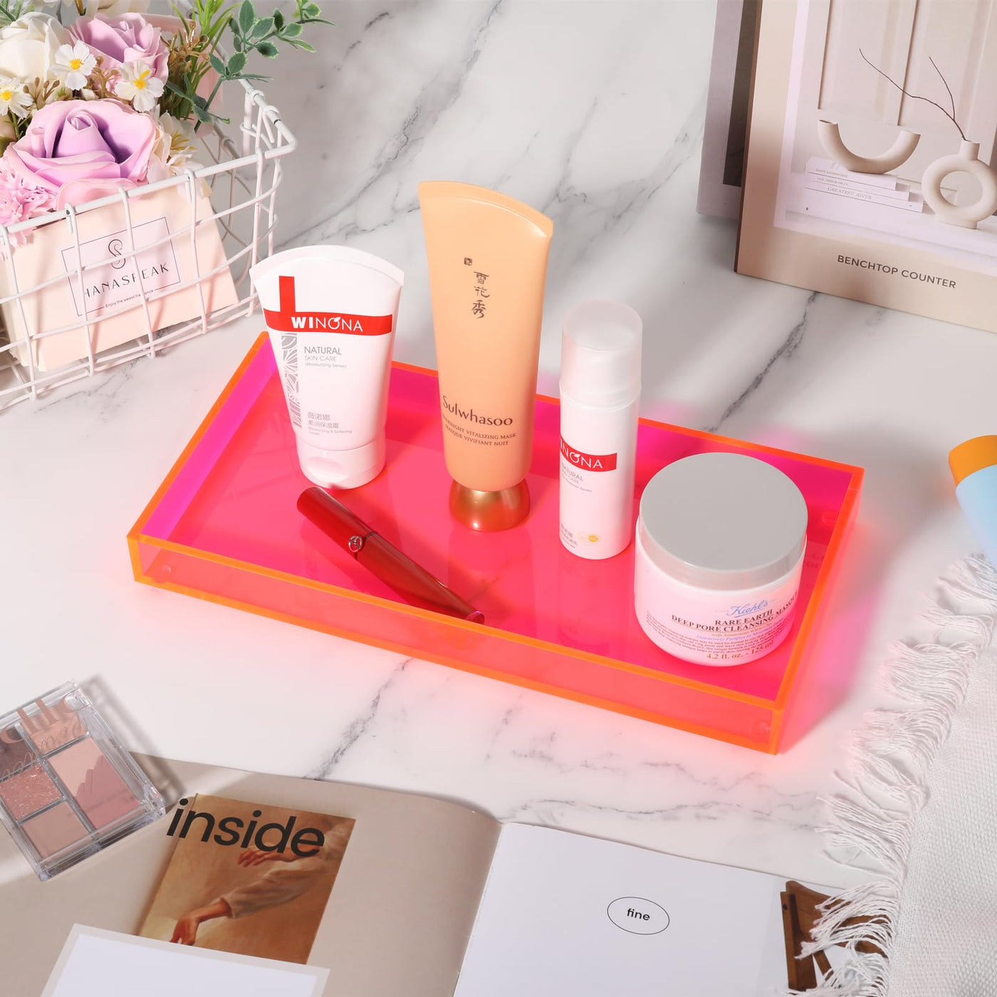 Acrylic Tray For Vanity Makeup Perfume Jewelry 12X6'' Small Decorative Tray For Bathroom Dresser Tops Candle Sink Counter, Neon