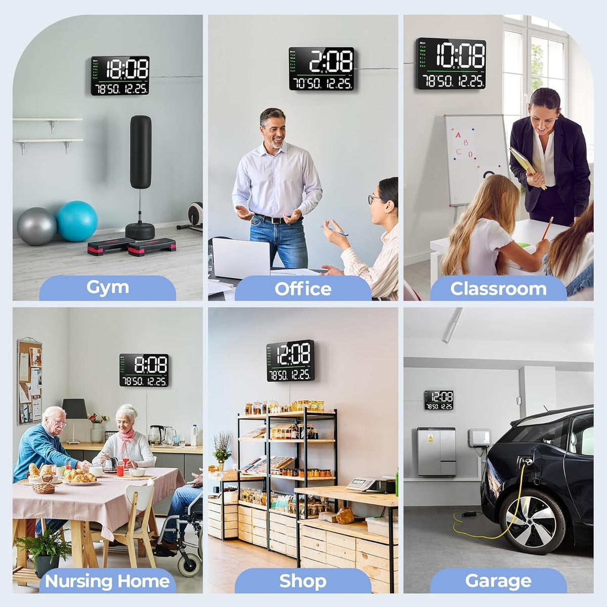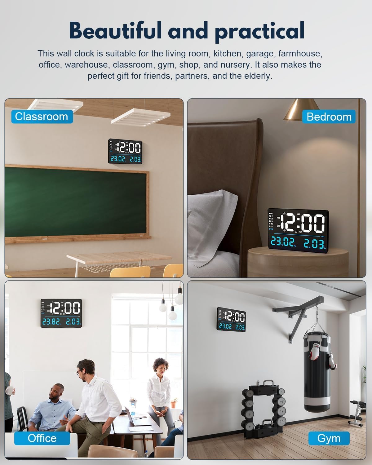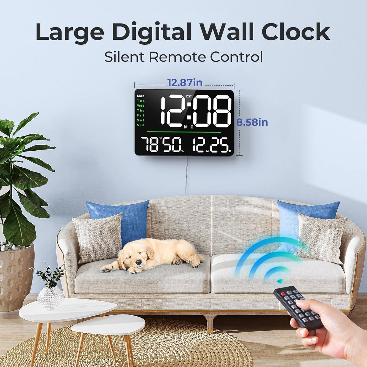Aerys 16-Inch Digital Wall Clock, Large Led Display With Remote Control, Auto/Custom Dimmer, Temp & Humidity, Dual Alarms, For L