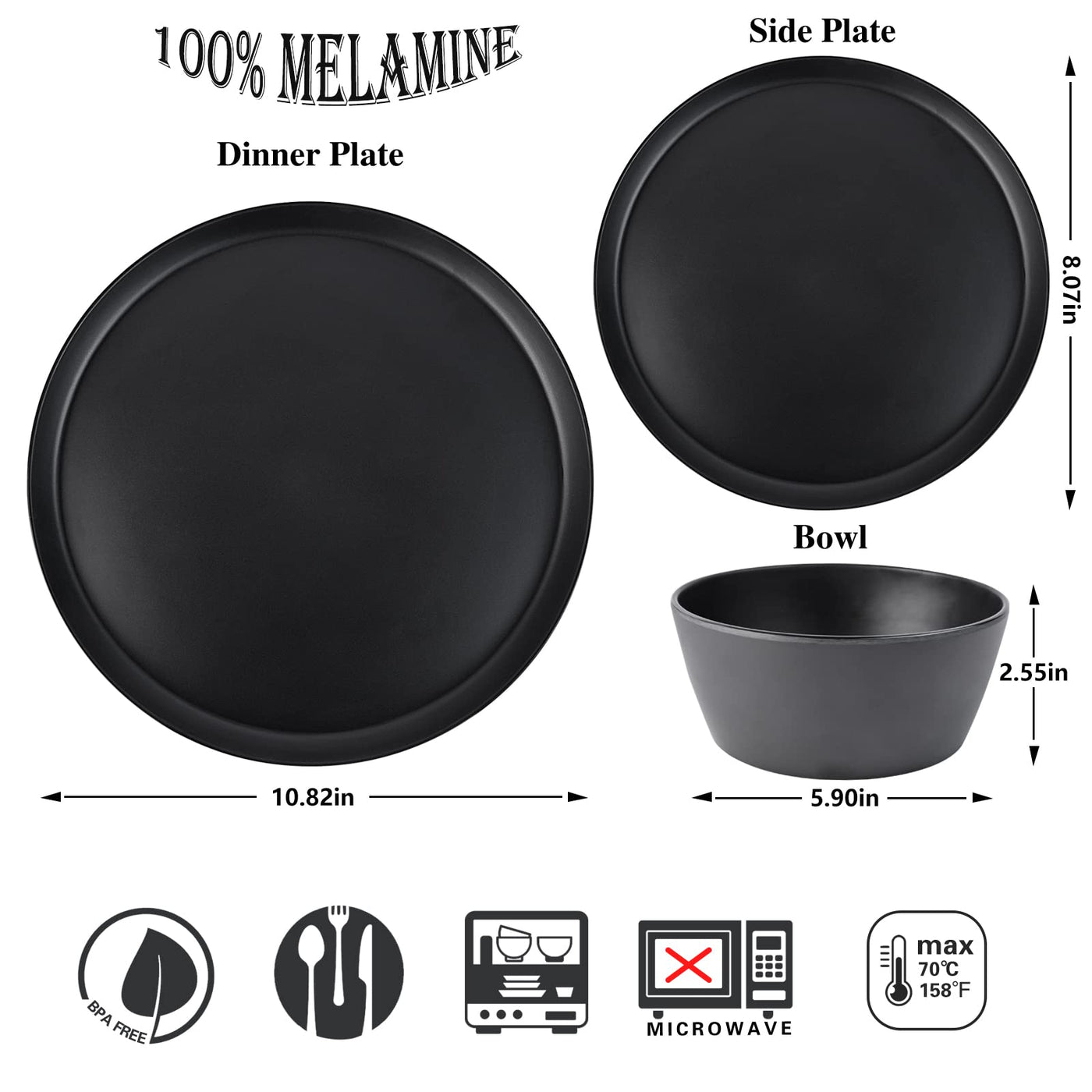 Afcevnlb 12-Piece Plastic Dinnerware Set Plates And Bowls Sets Service For 4 Matte Black Melamine Plates Unbreakable Plastic Out