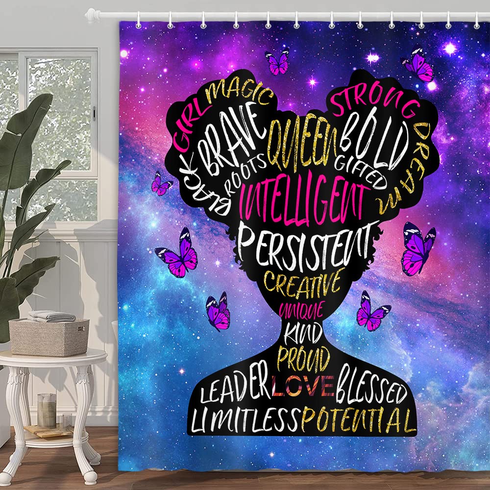 - Q: What style does the shower curtain feature? A: The shower curtain features a unique and inspirational design, showcasing an African American girl with afro hair and butterflies against a starry sky backdrop.