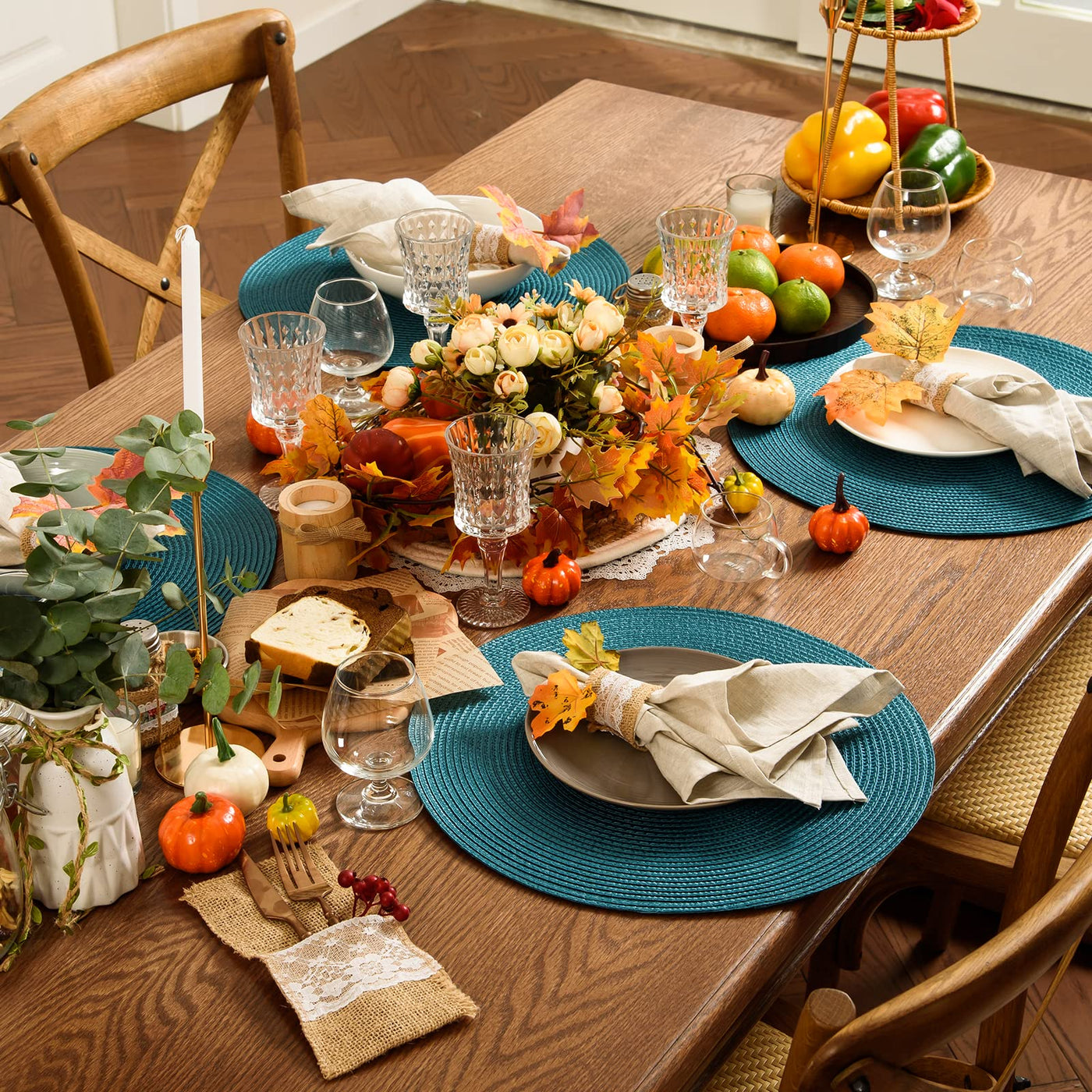 - Q: What colors are available for the AHHFSMEI Round Braided Placemats? A: The placemats are available in teal.