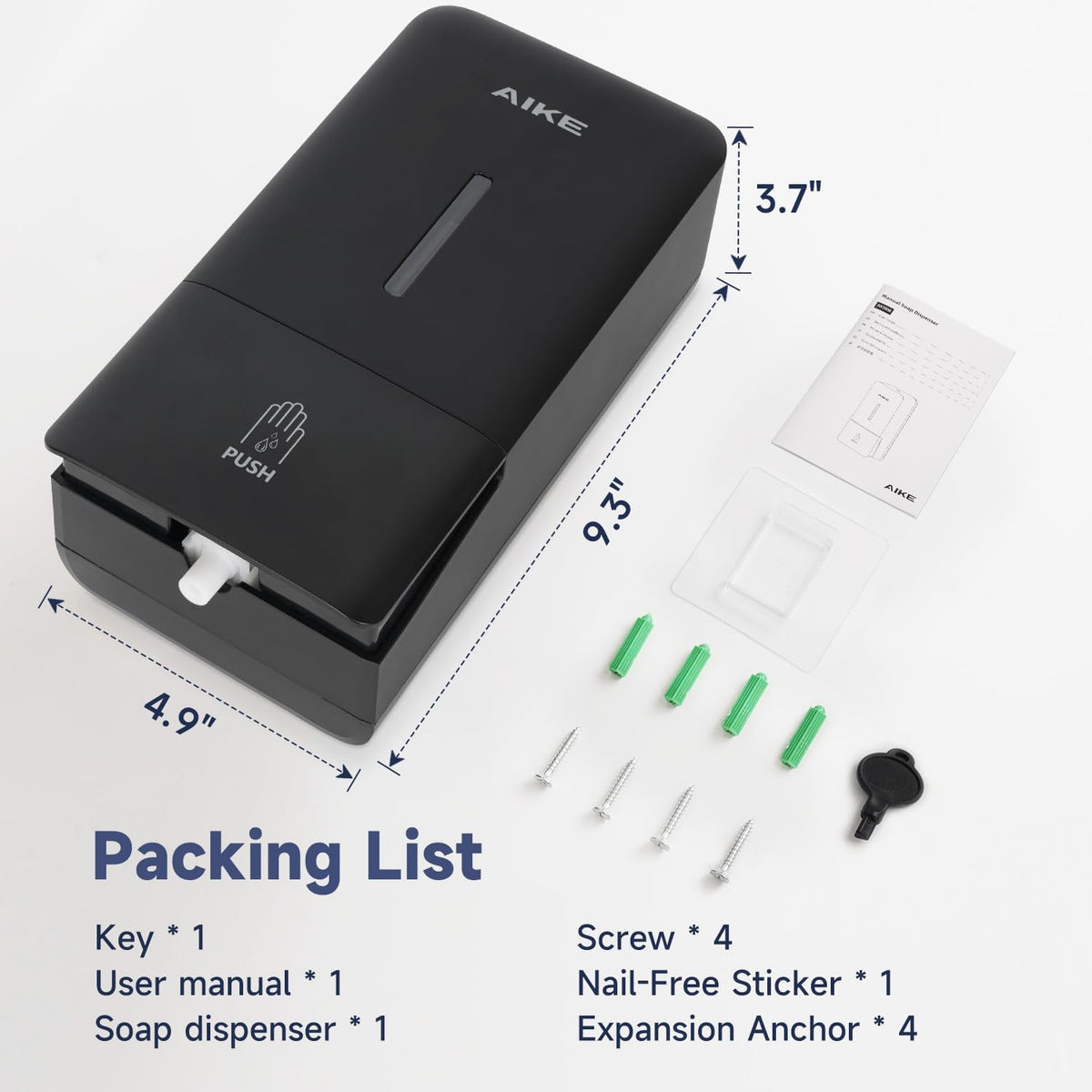 • Q: Is the soap dispenser suitable for commercial use? A: Yes, the AIKE soap dispenser is designed for commercial use, making it ideal for bathrooms in offices, restaurants, and other public spaces.