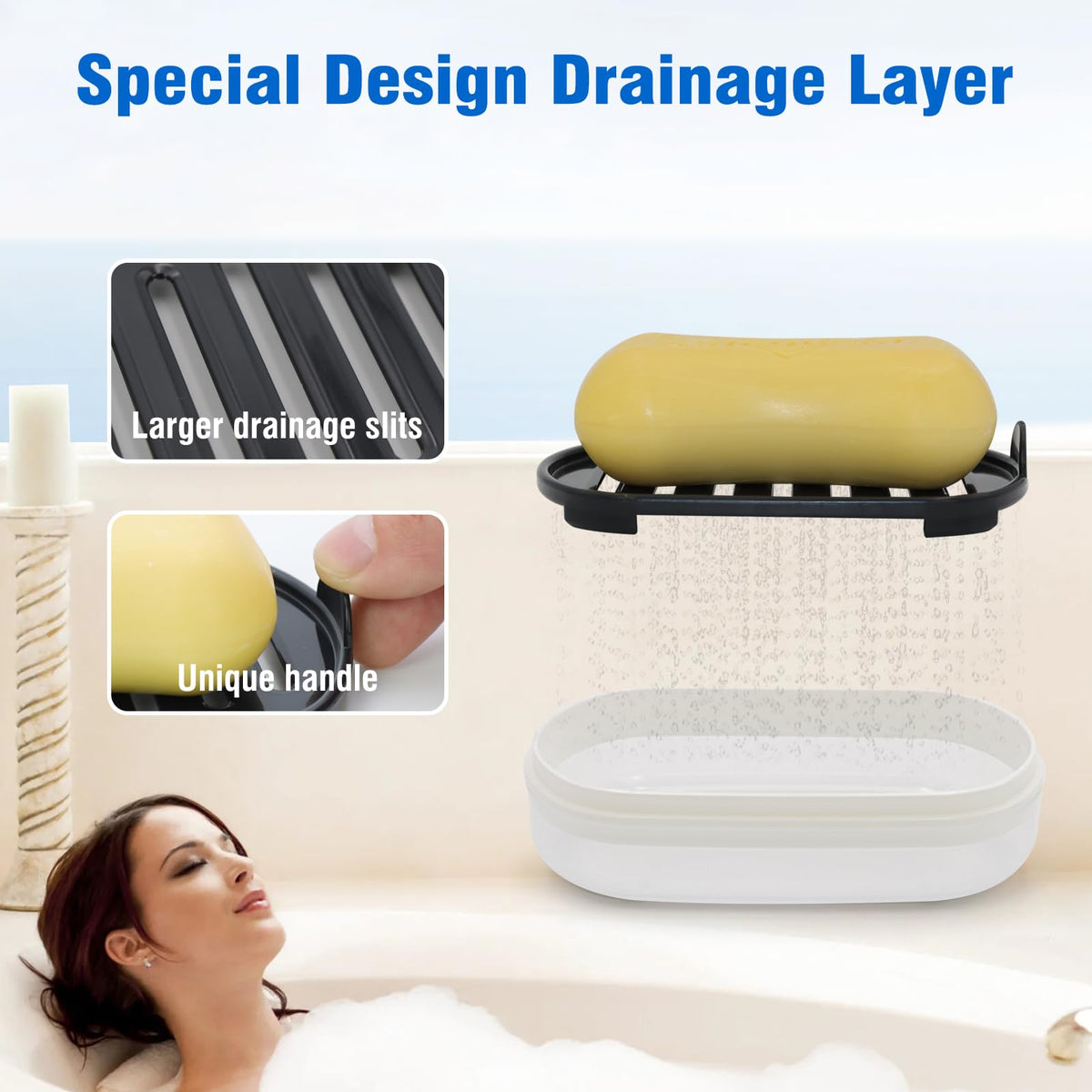 - Q: How does the drainage system work? A: The soap holder features a drain tray with grids and padded feet that allows for quick drainage, preventing the soap from sitting in water at the bottom.
