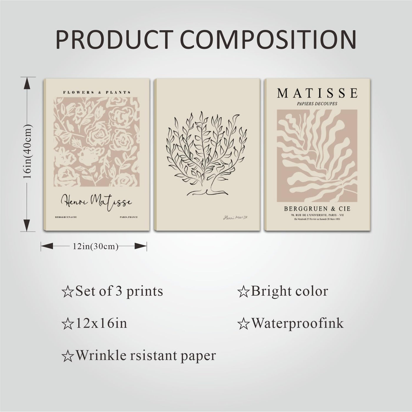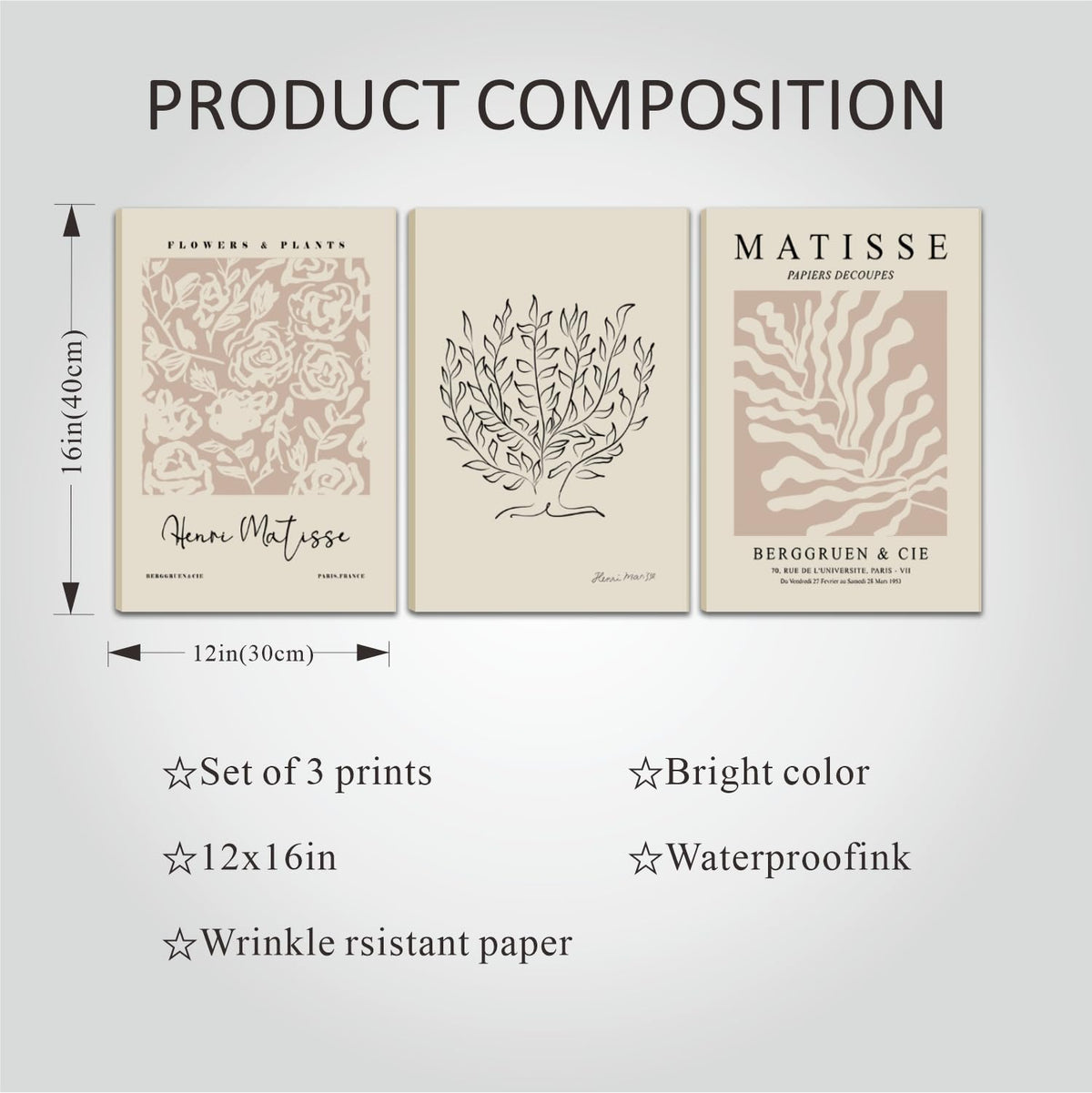 • Q: What are the dimensions of the Matisse Aesthetic Canvas Wall Art prints? A: Each print in the Matisse Aesthetic Canvas Wall Art Set measures 12 inches by 16 inches, making them a versatile size for various wall spaces.