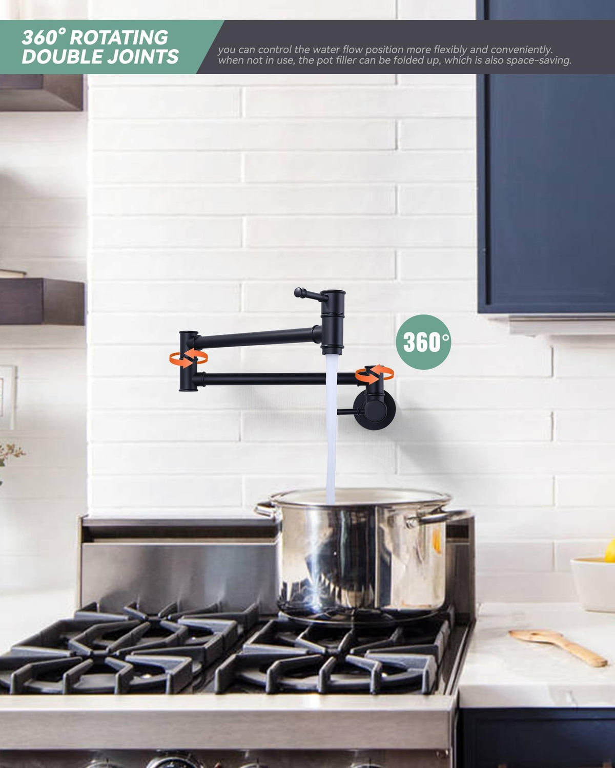 - Q: How does the 360-degree rotation feature work? A: The faucet features a 360-degree rotation that allows the arms to swivel fully, providing maximum reach and flexibility to fill pots from various positions.