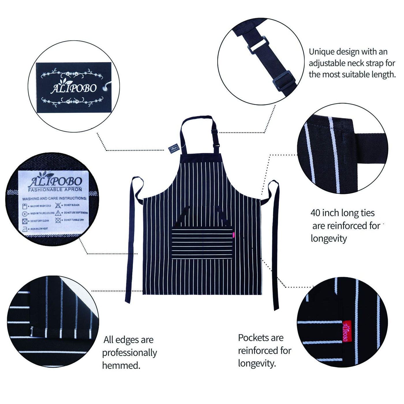 Alipobo Kitchen Cooking Apron For Women And Men, Adjustable Chef Bib Apron With Pockets - 32'' X 28'' - Black/White Pinstripe- 1