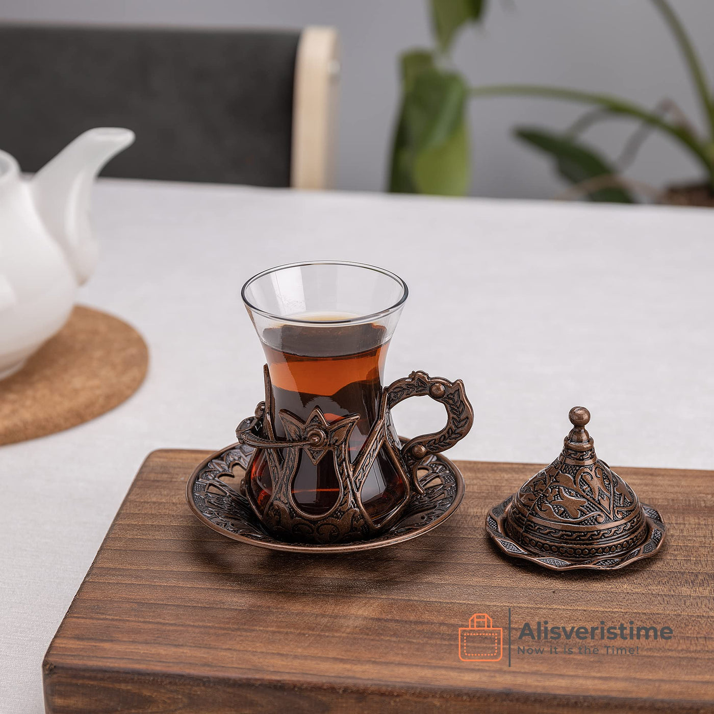 Alisveristime (Set Of 6 Handmade Turkish Tea Water Zamzam Serving Set Glasses Saucer And Spoon (Copper)