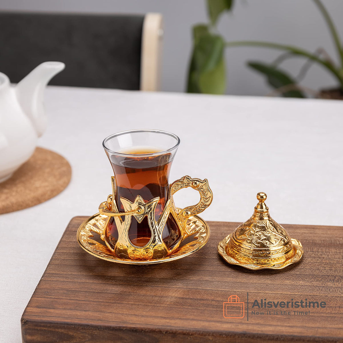 - Q: What is included in the Alisveristime Turkish Tea Glass Set? A: The Alisveristime Turkish Tea Glass Set includes six handmade tea glasses, six motif-laden saucers, and six beautifully adorned tea spoons embellished with random crystal colors.