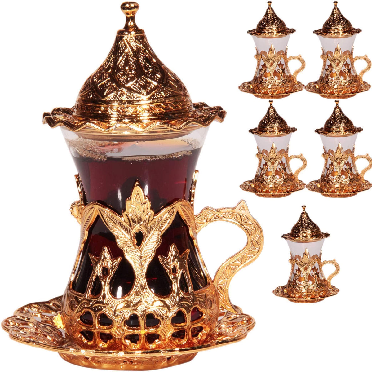 Alisveristime (Set Of 6 Handmade Turkish Tea Water Zamzam Serving Set Glasses Saucer (Gold)