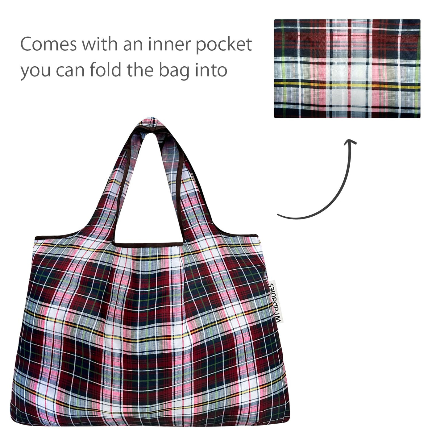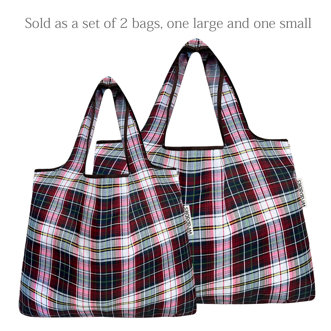 Allydrew Large & Small Foldable Tote Nylon Reusable Grocery Bags, Set Of 2, Red Plaid