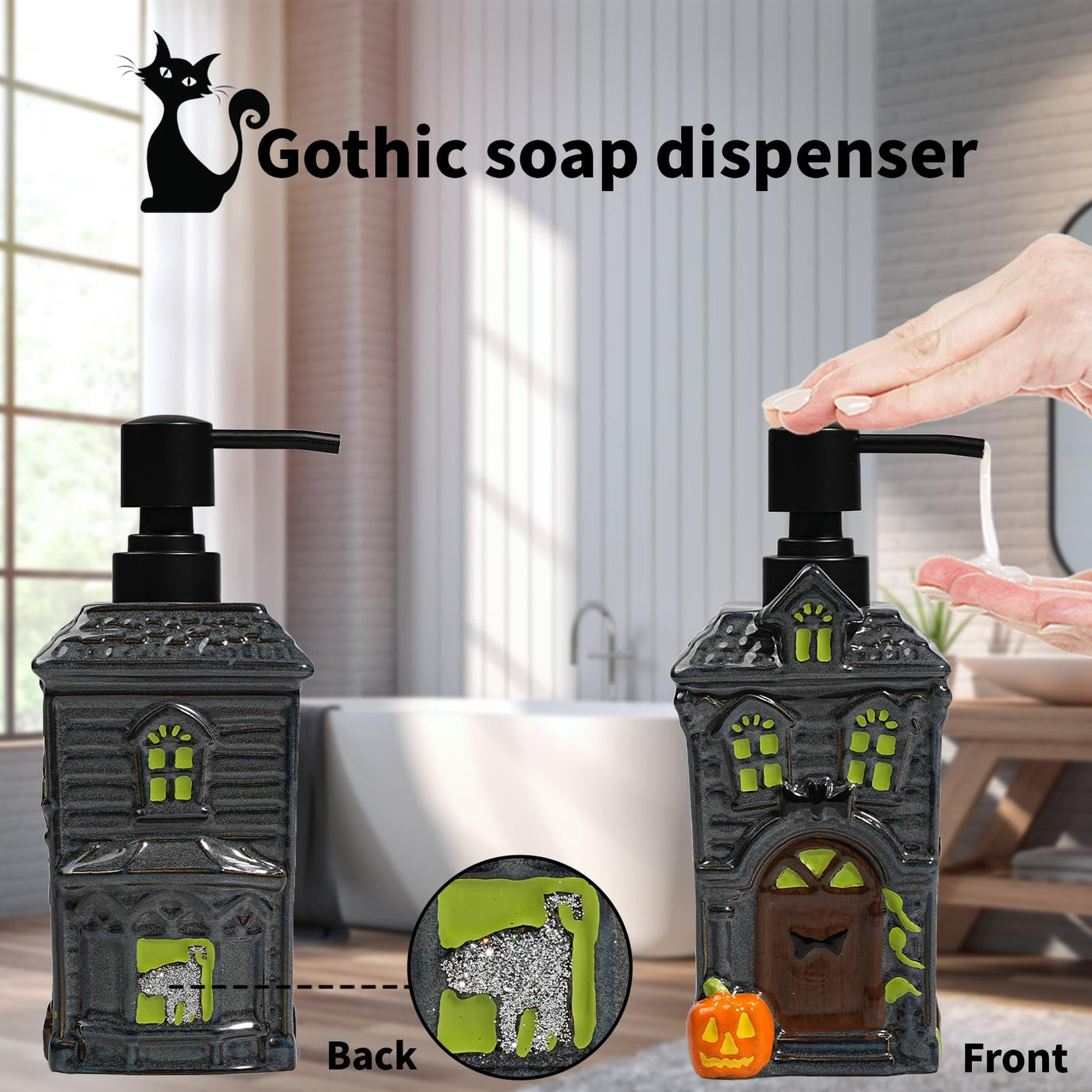 - Q: Does the soap dispenser have a unique design? A: Yes, it features a funny-face pumpkin on the front and a handmade kitten on the back, adding a unique touch to your Halloween decor.