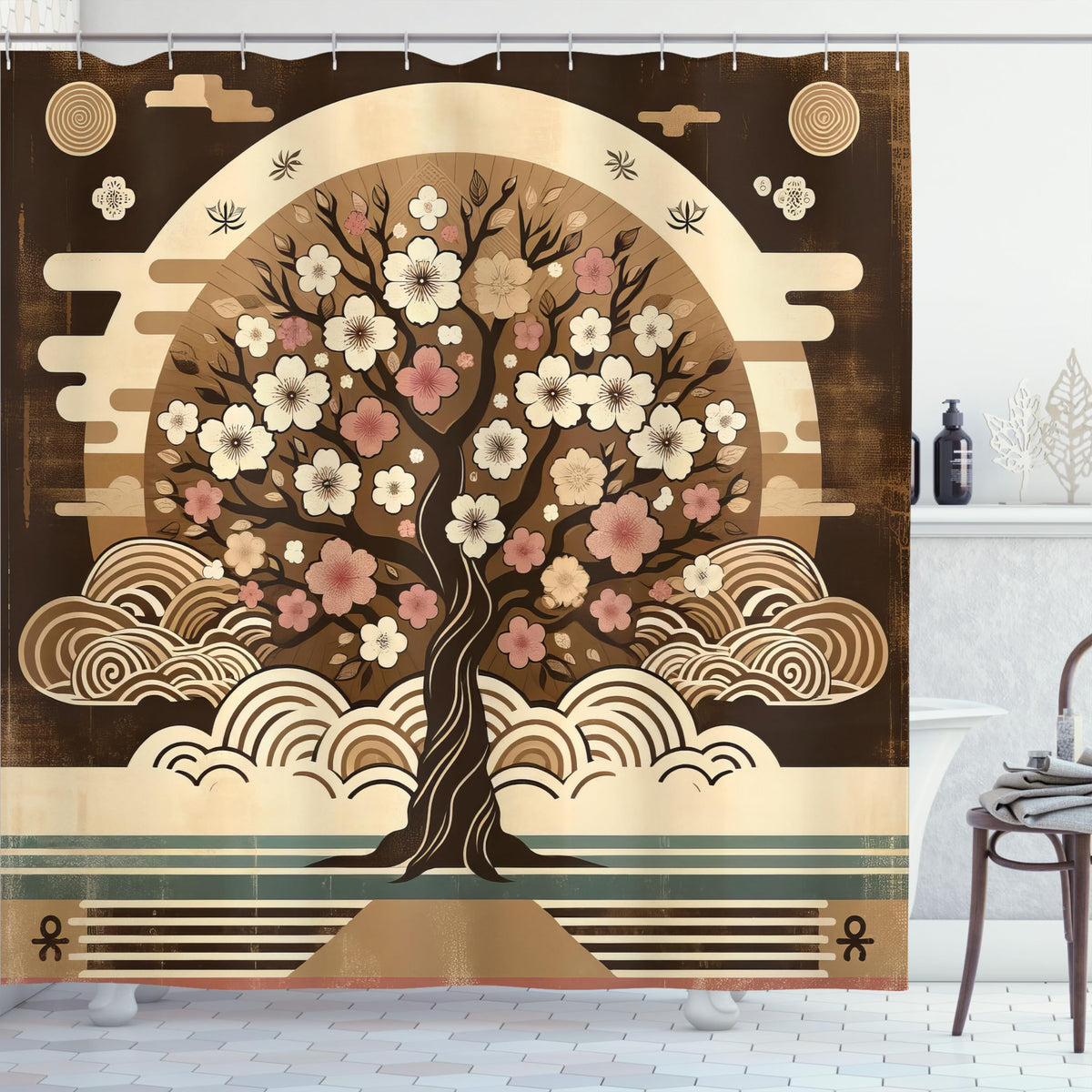 - Q: What kind of design does the shower curtain feature? A: The curtain has an Asian cultural-inspired tree design with a grunge earthy style and floral branches.
