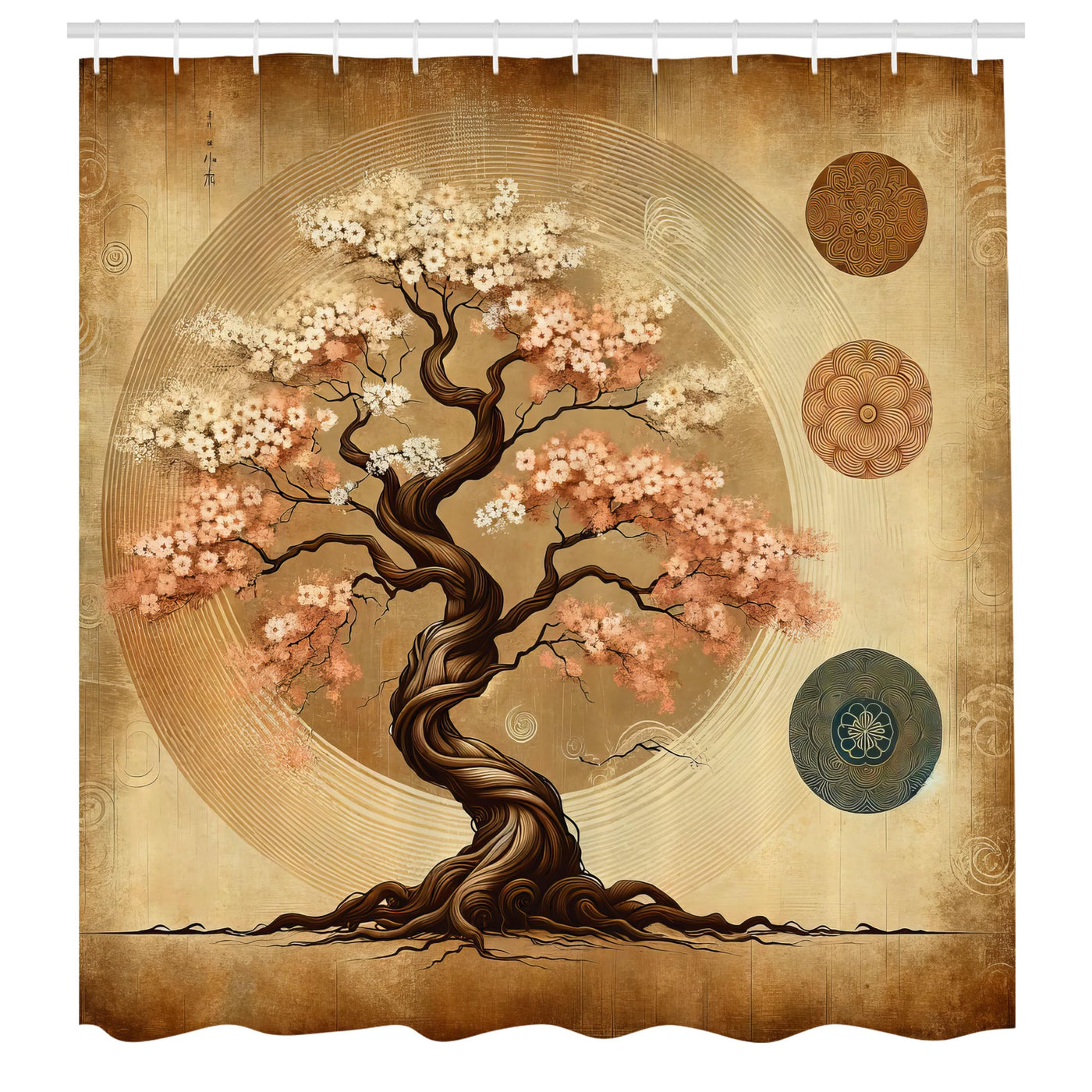 • Q: What type of design does the shower curtain have? A: The shower curtain features a unique ethnic weathered style with a rustic folkloric motif of a spring tree in a Japanese garden.