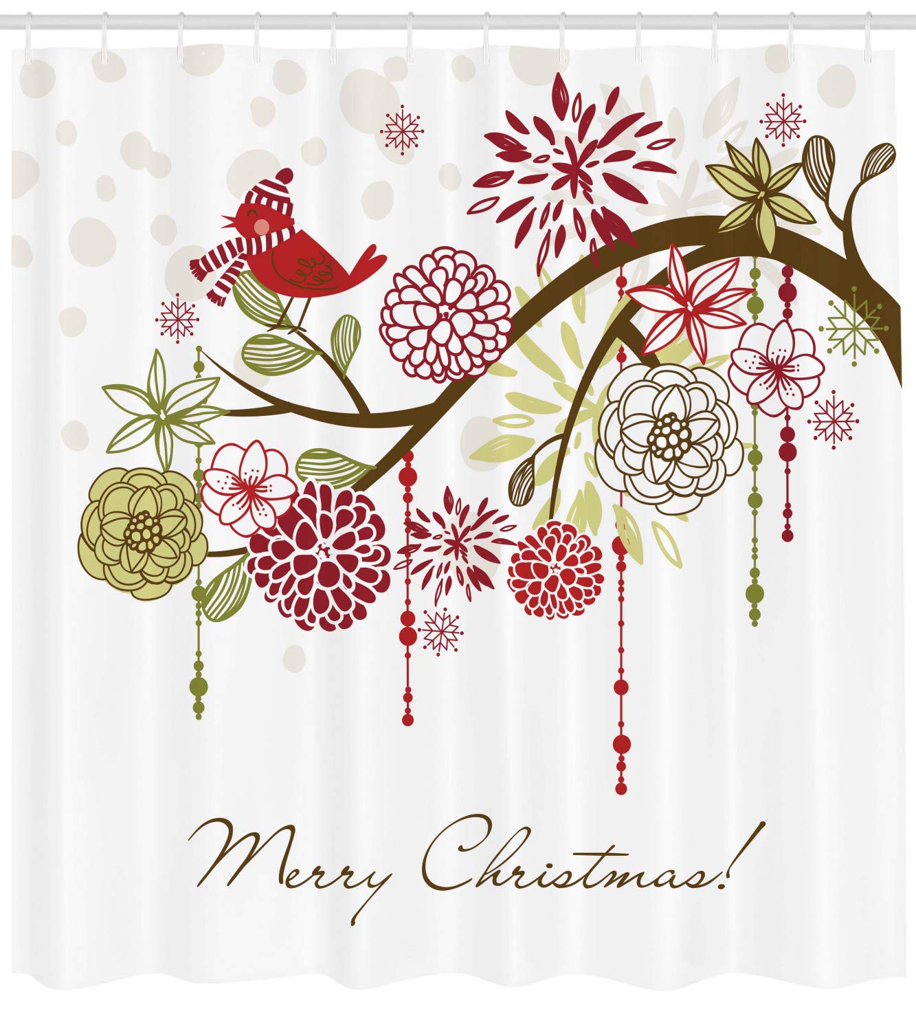 Ambesonne Christmas Shower Curtain, Floral Winter Red Bird Hat And Scarf On Blooming Tree Nature Inspired, Cloth Fabric Bathroom