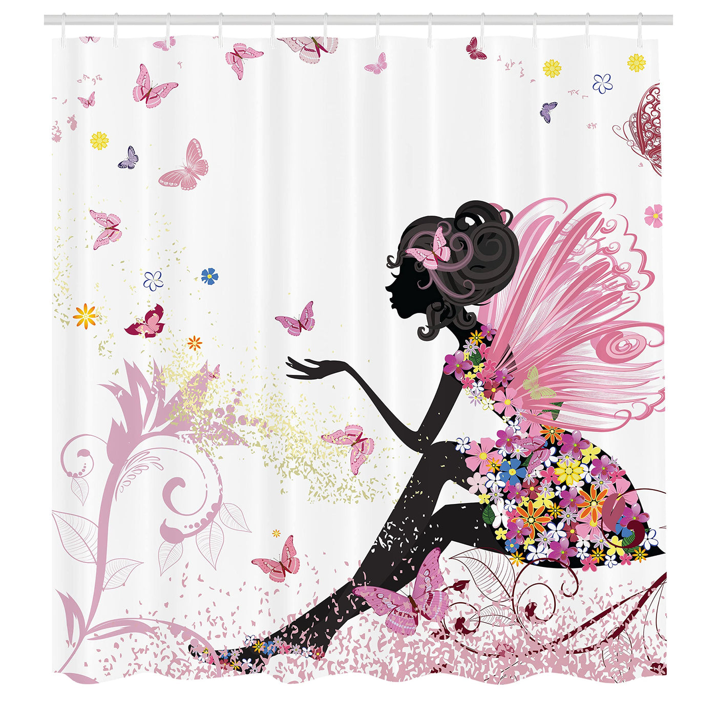 Ambesonne Fantasy Shower Curtain, Girl Silhouette In A Floral Dress Surreal Garden Flying Butterflies Print, Cloth Fabric Bathro