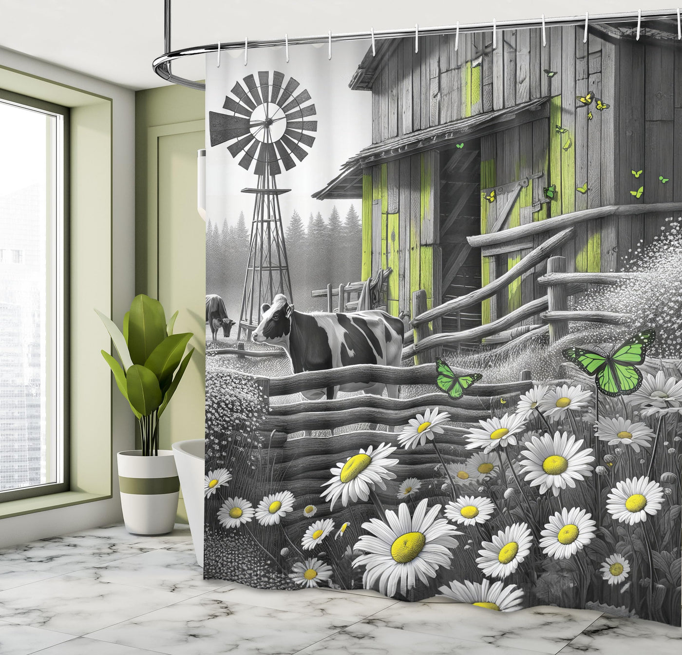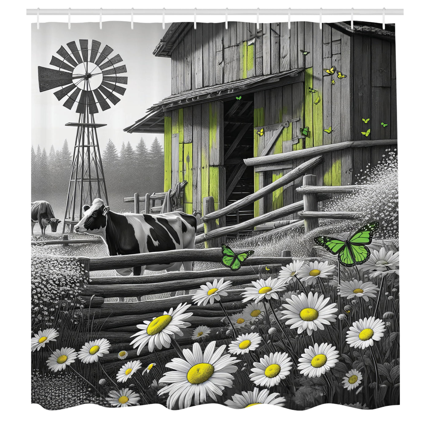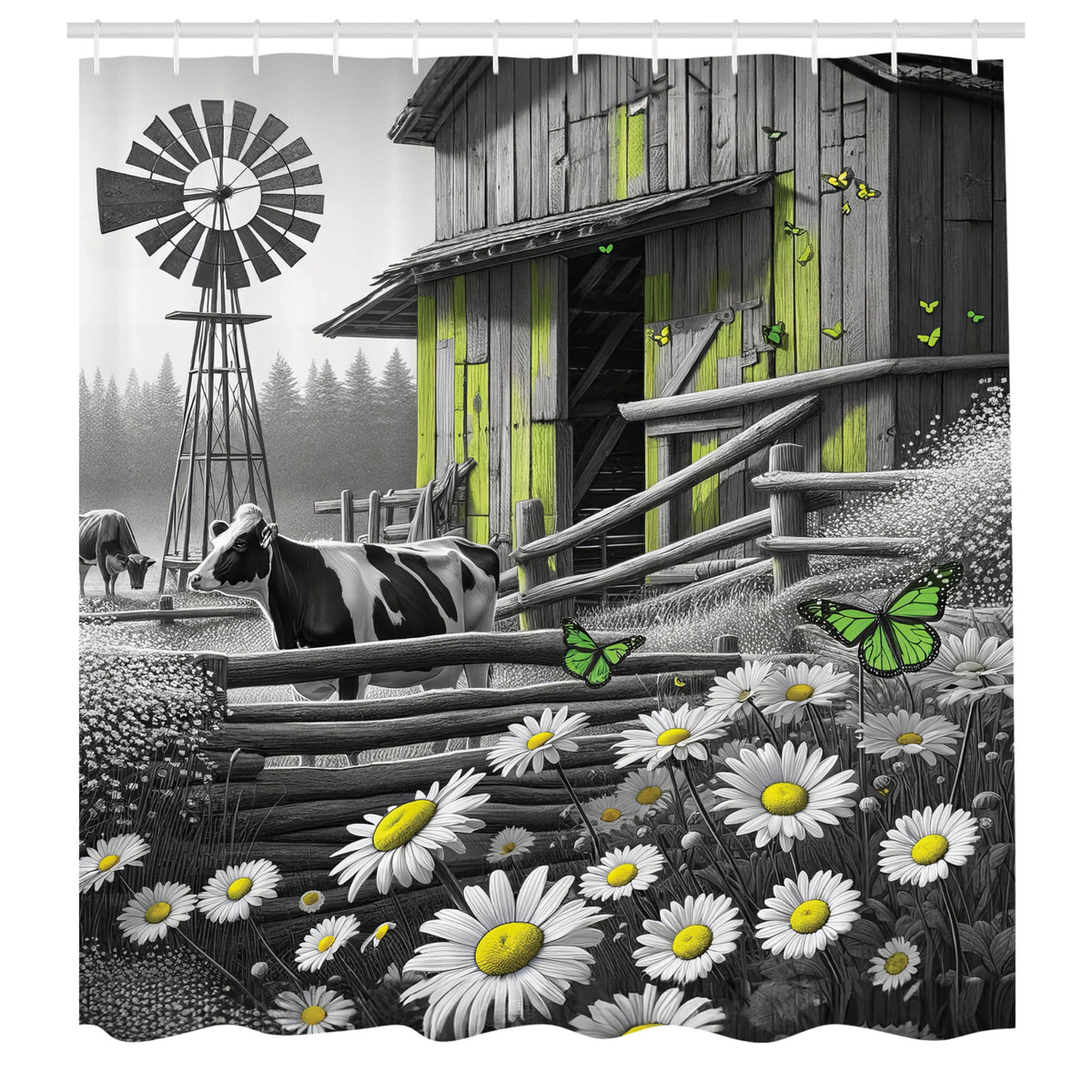 - Q: What is the design theme of the shower curtain? A: The shower curtain features a black and white effect barn with cow and butterflies, along with a farm life windmill design.