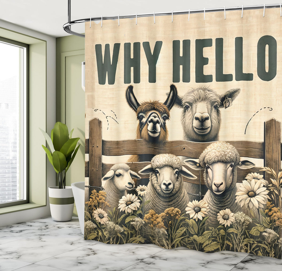 Ambesonne Farmhouse Shower Curtain, Why Hello Lettering With Alpaca Cow And Sheep In Meadow Flowers, Cloth Fabric Bathroom Decor