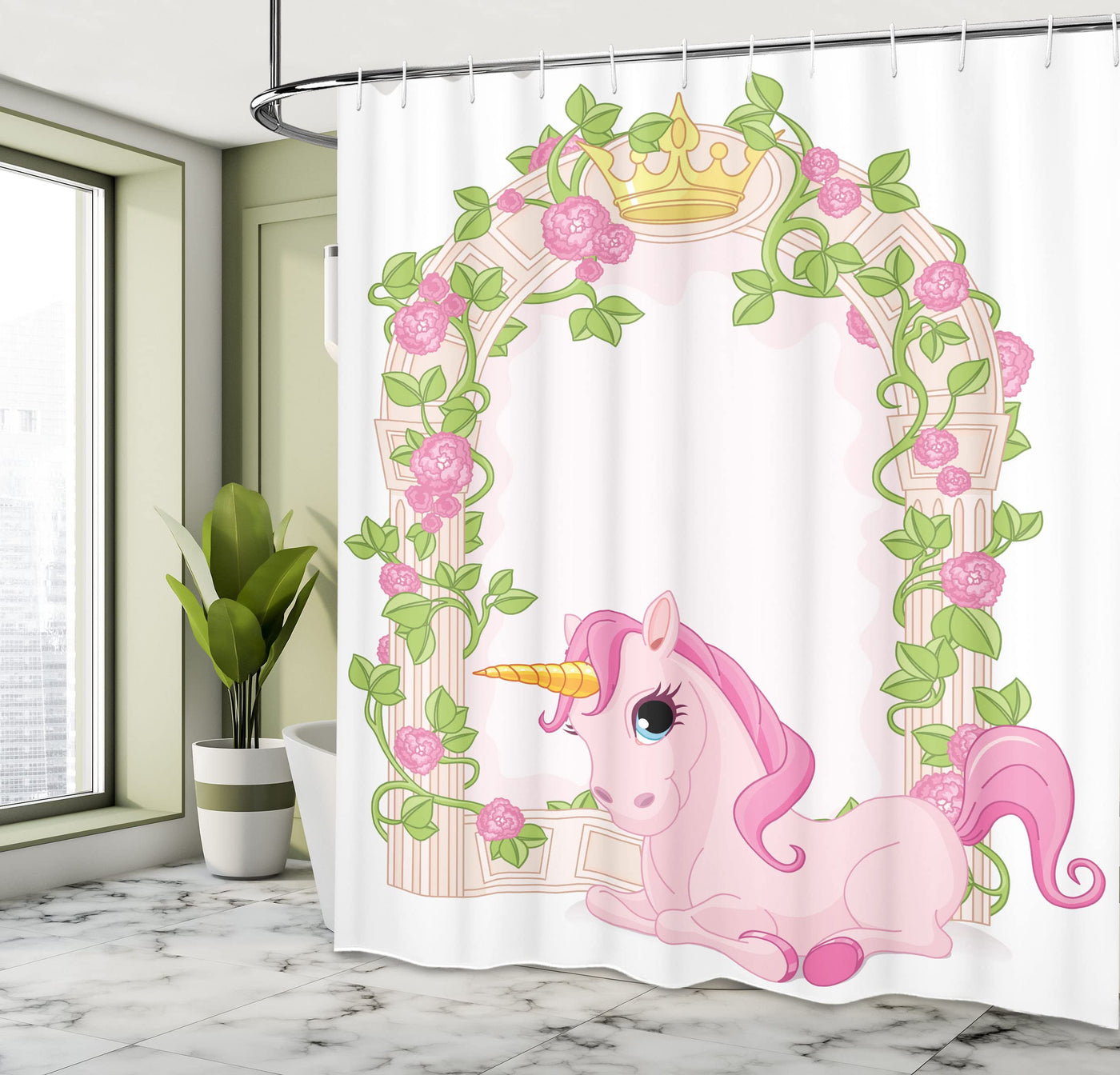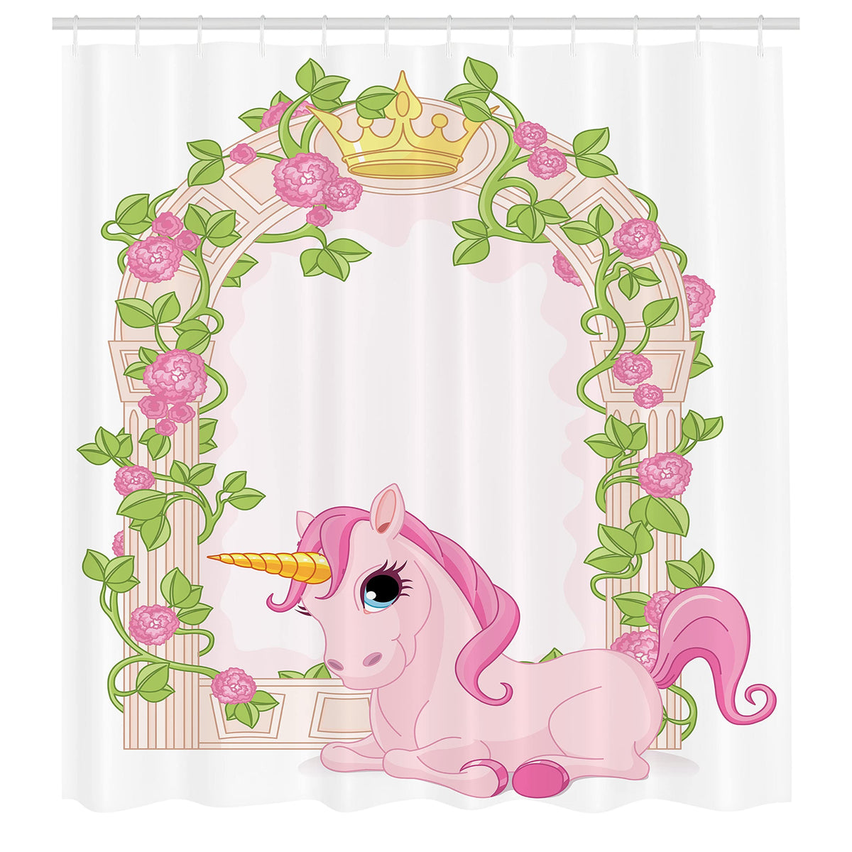 Ambesonne Feminine Shower Curtain, Romantic Floral Arch Frame With Roses Leaves Unicorn Magic Illustration, Cloth Fabric Bathroo
