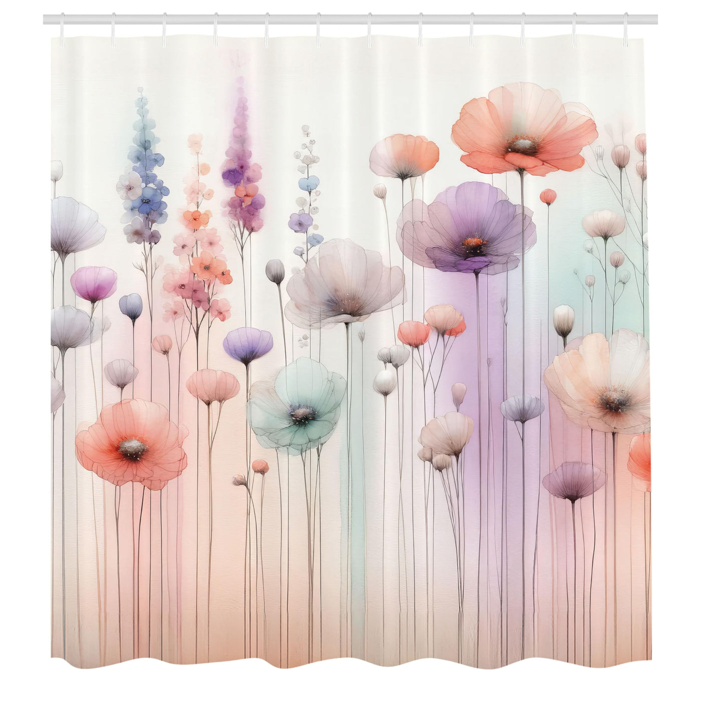 Ambesonne Floral Shower Curtain, Dreamy Silhouettes Of Fantasy Woods Gentle Poppy Flowers And Lavenders, Cloth Fabric Bathroom D