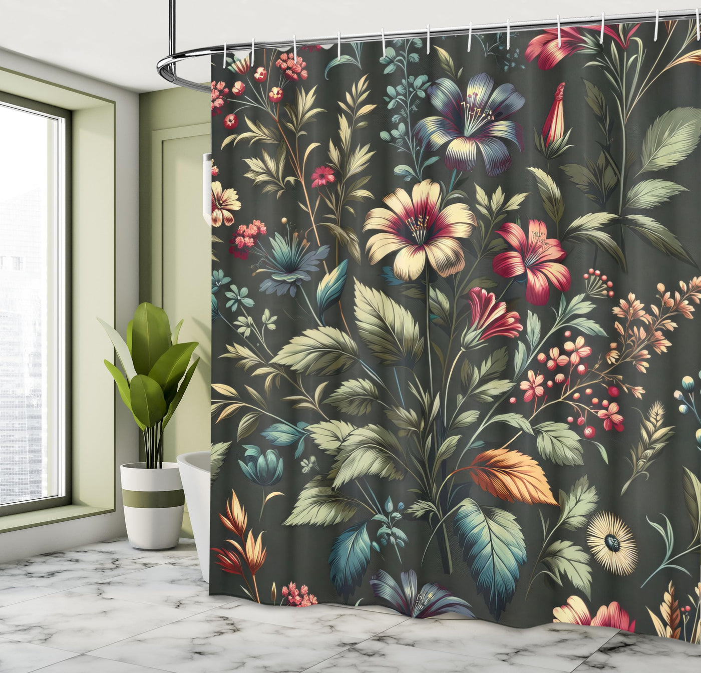- Q: What is the design of the shower curtain like? A: The shower curtain features a nostalgic concept with leafy jungle and hibiscus flowers, combined with modern details.