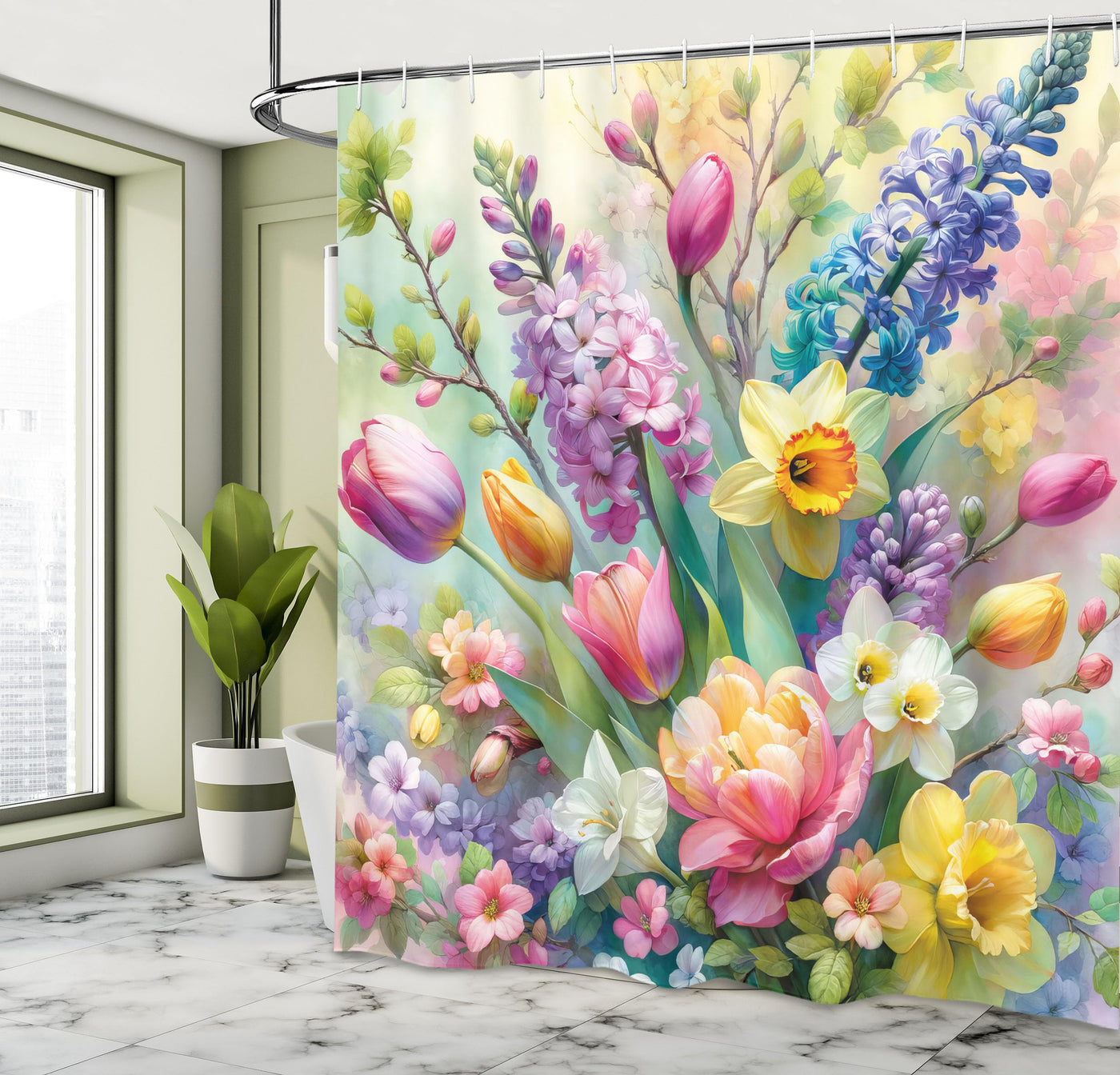 - Q: What are the dimensions of the Ambesonne Spring Shower Curtain? A: The Ambesonne Spring Shower Curtain measures 69 inches wide by 75 inches long.