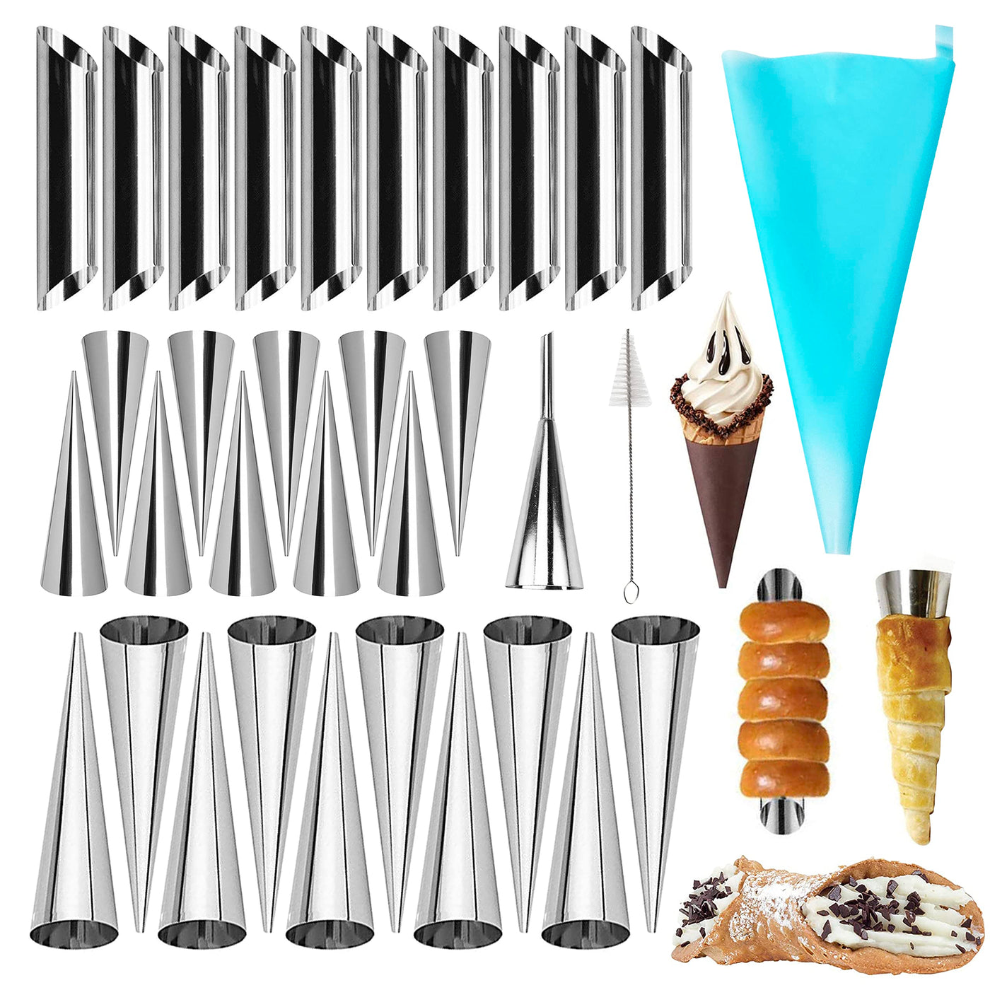 - Q: How many pieces are included in the cannoli forms set? A: The set includes 10 large cream horn molds, 10 small cream horn molds, and 10 large cannoli tubes, along with a reusable piping bag, a long stainless steel piping tip, and a cleaning brush.