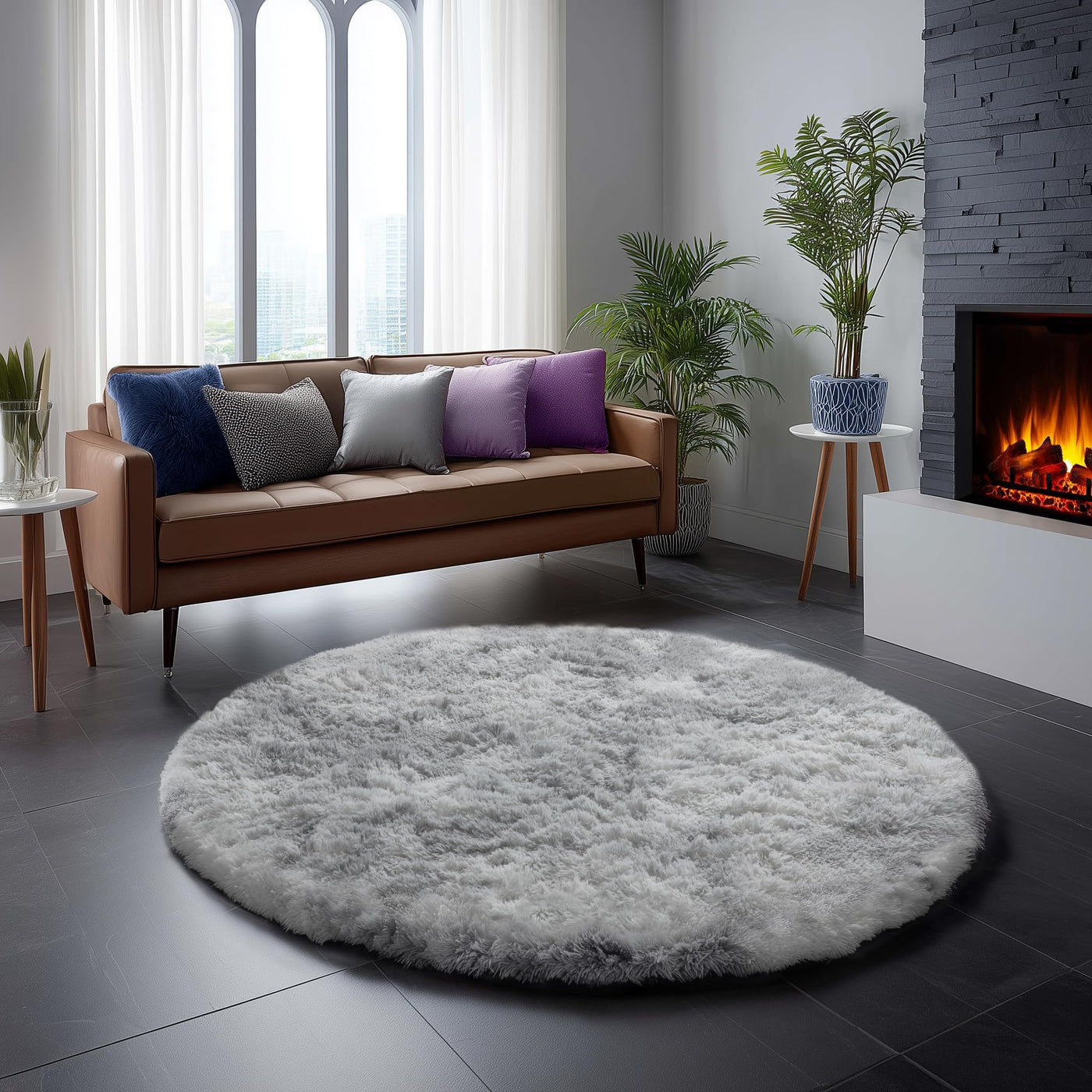 Amdrebio Tie-Dye Light Grey Round Circle Area Rugs 5Ft for Living Room Bedroom, Soft Fluffy Fuzzy Shag Rug for Kids Room Home Of