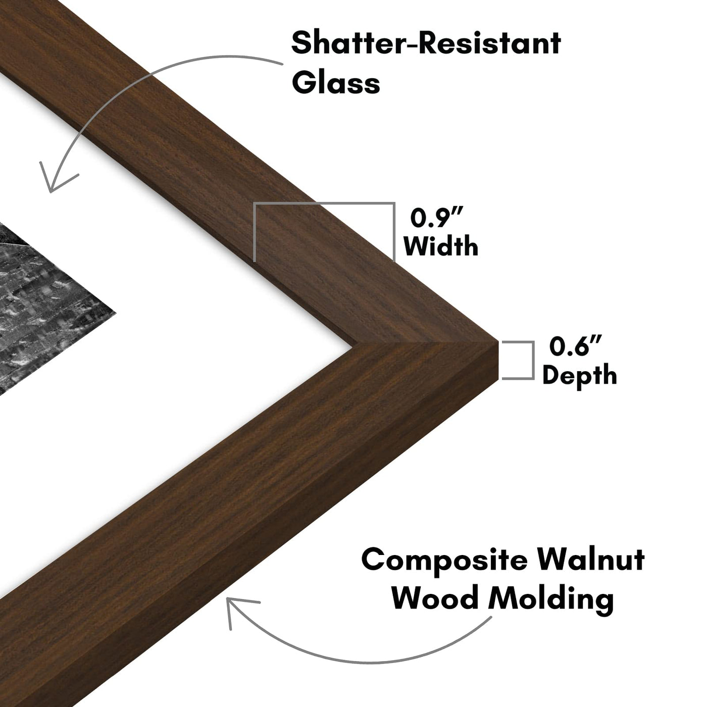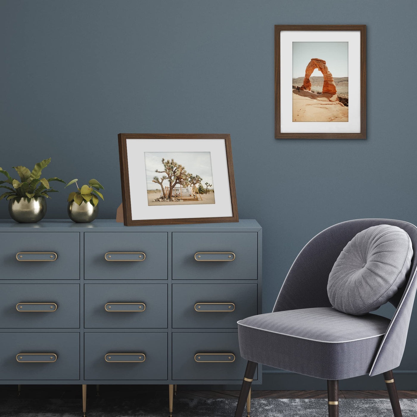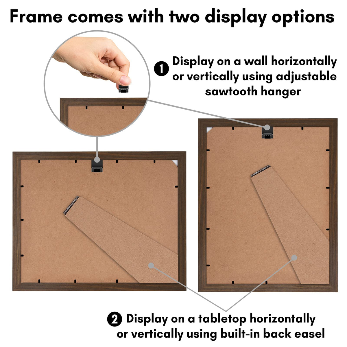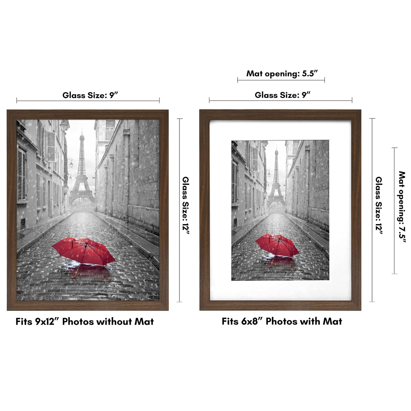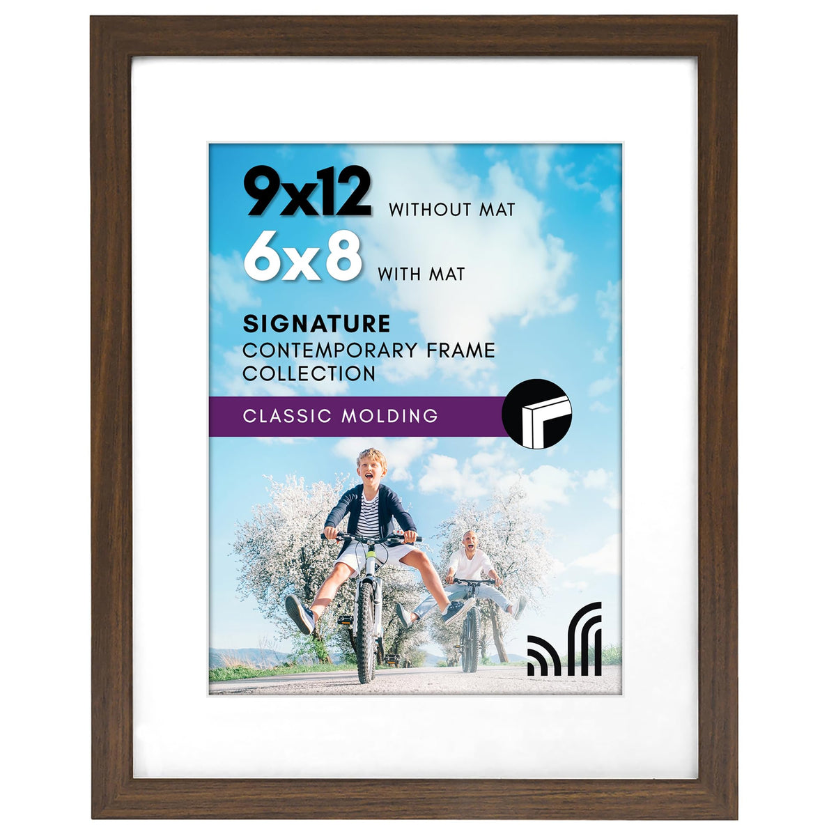 Your cherished memories deserve a timeless frame. Highlight your favorite moments with this sleek picture frame, featuring a walnut-inspired woodgrain finish, designed to add a refined look to your home or office. | Our 9x12 frame with classic molding is crafted from engineered wood (MDF) and displays 9x12 photos or 6x8 photos with mat (actual mat size: 5.5x7.5). The shatter-resistant glass adds a pristine finish, making this frame truly stand out. | Display it your way with ease! The picture frames include hanging hardware for quick and easy wall mounting and an easel stand for tabletop display, ensuring your special moments are always showcased. | Say goodbye to boring walls with these gallery-style frames. They make your photos or artwork look so good that you