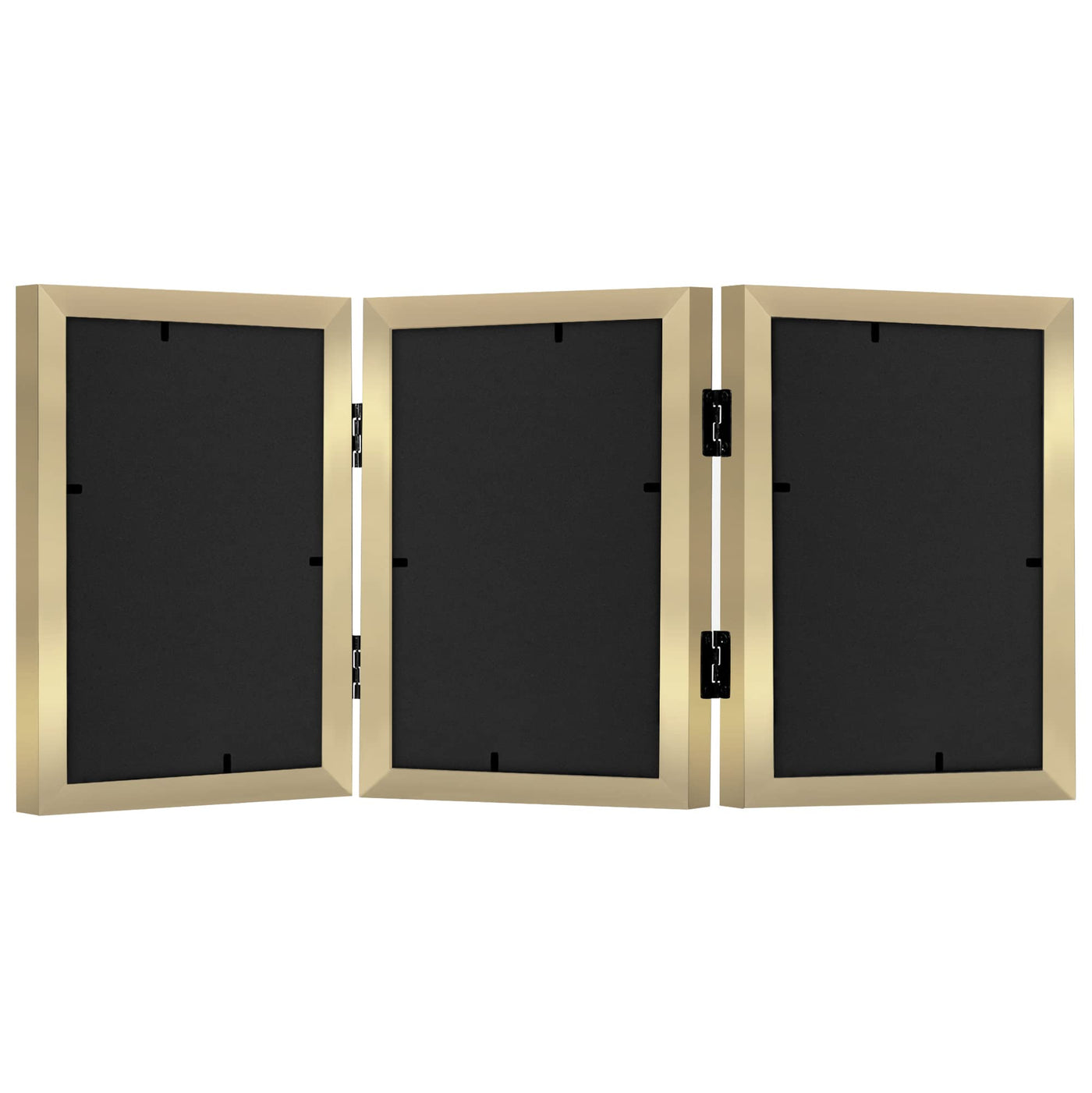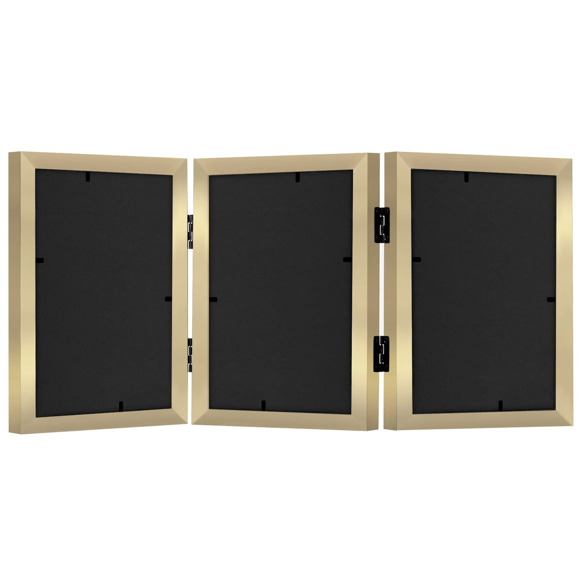 Your memories deserve nothing less than a touch of elegance. Frame your favorite moments with this stunning gold frame, designed to elevate your home or office and make a lasting statement. | Our 5x7 picture frame with classic molding is crafted from engineered wood and displays three 5x7 photos. The shatter-resistant glass adds a pristine finish, making this stylish frame frame truly stand out. | Display it your way with ease! These triple picture frames include sturdy hinges for easy display on tabletops, desk, shelves, or mantel in a vertical format so your special moments will always be beautifully showcased. | Create a personal moment on any surface. Our gallery-style frame turns your photos or artwork into a curated display, while the sleek, space-conscious design adds a modern touch to any room. No wall space required - just unfold, place, and enjoy. | Why Choose Americanflat: Our expertly crafted decor, including this photo frame, offers style and protects your cherished moments. Thoughtfully packaged for safe delivery, Americanflat combines quality and design to enhance any space.