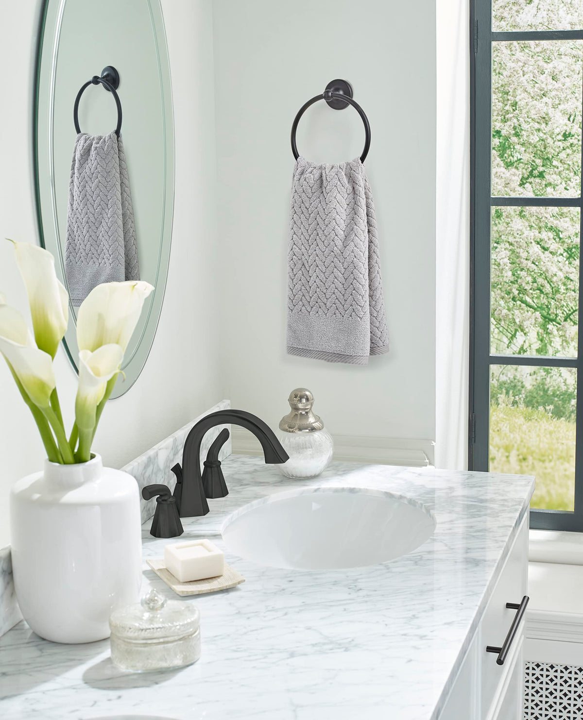 • Q: What style does the Amerock Matte Black Towel Ring feature? A: The towel ring showcases a timeless traditional style, making it a versatile addition to various bathroom or powder room decors.