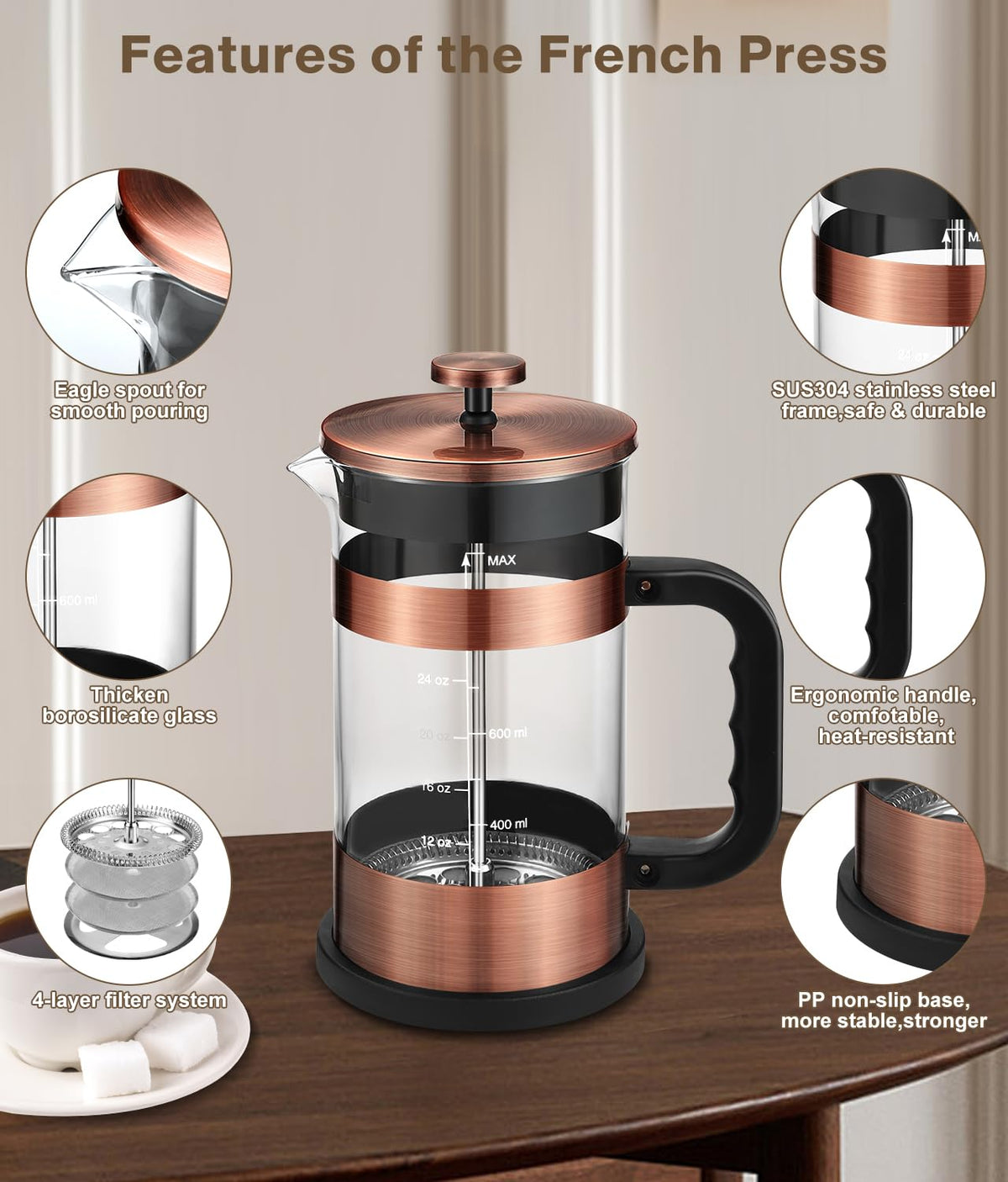 • Q: Is the French Press easy to clean? A: Yes, the French Press is designed for easy cleaning. The large mouth of the glass carafe allows for simple rinsing, and the plunger and filter screen can be disassembled for thorough cleaning.