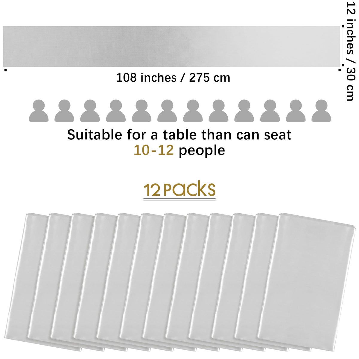 - Q: What are the dimensions of each table runner? A: Each table runner measures 12 inches by 108 inches, or 30 centimeters by 275 centimeters.