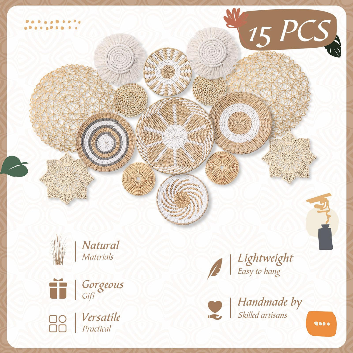 Anglechic 15 Pcs Boho Wall Basket Decor Woven Rattan Seagrass Wall Decor Hanging Rustic Farmhouse Western Wall Art Decoration Fo