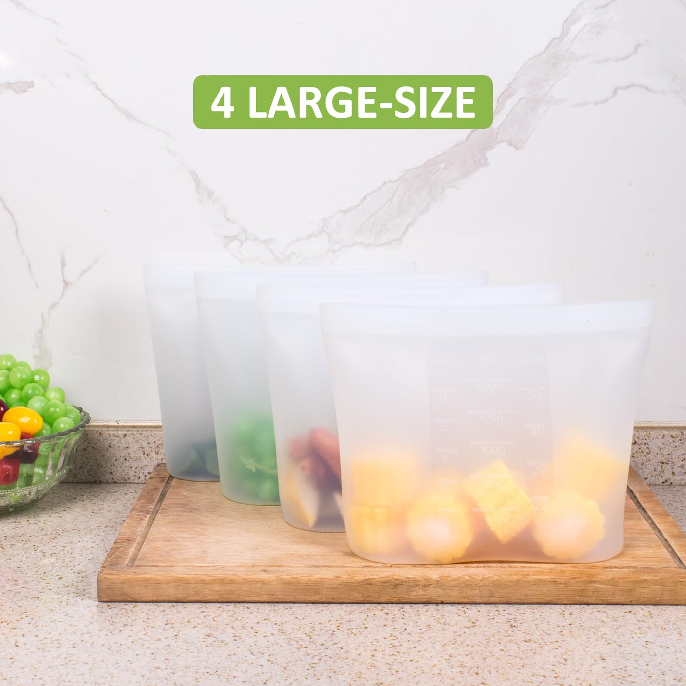 Annaklin Large Reusable Food Bags 4 Pack, 1.5 Quart(50.7Fl.Oz) 100% Silicone Food Storage Bags Stand Up Zip Silicone Bags For Fo