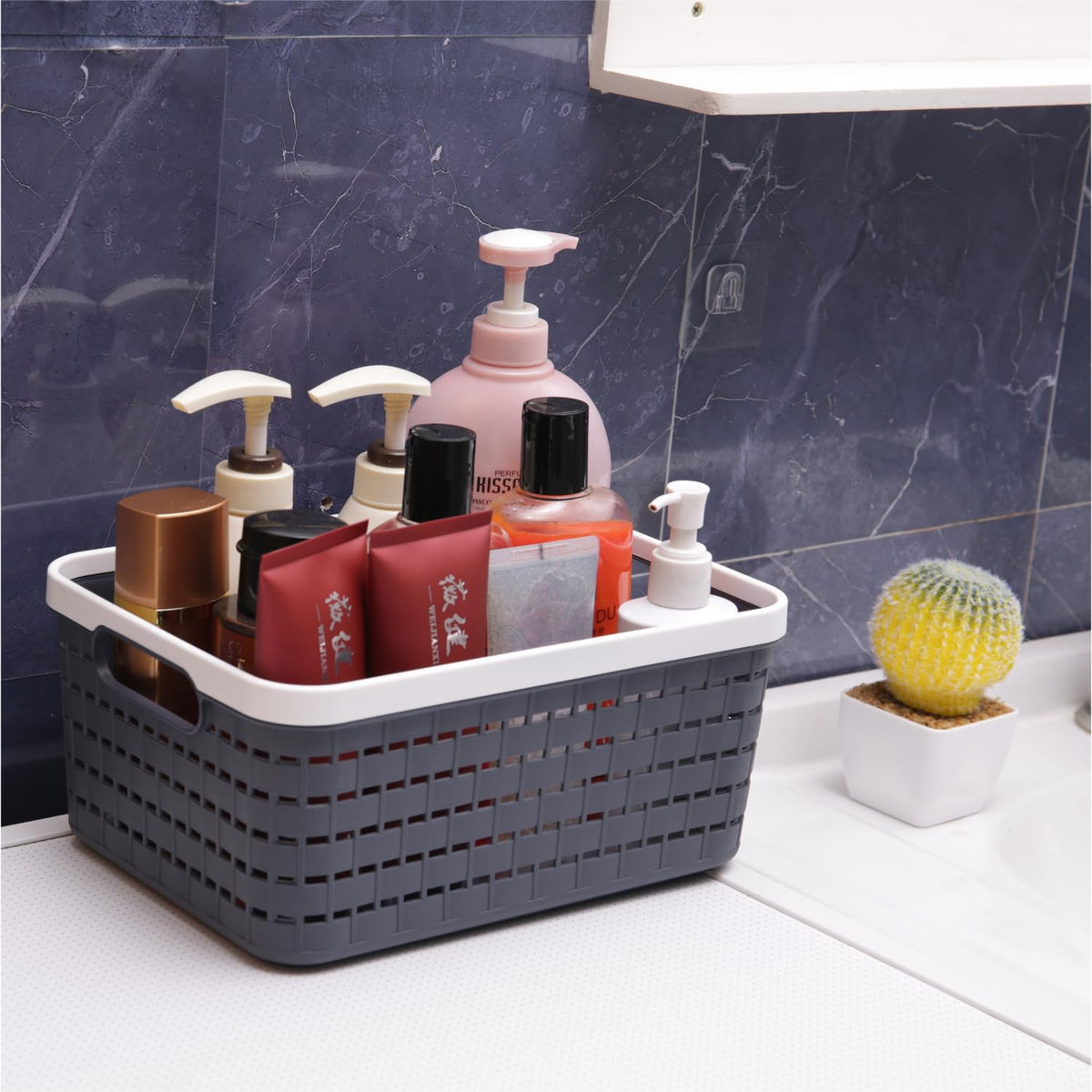 • Q: What items can I store in these baskets? A: You can store various items such as towels, toilet paper, paper towels, napkins, facial cleanser, shampoo, shower gel, and more.
