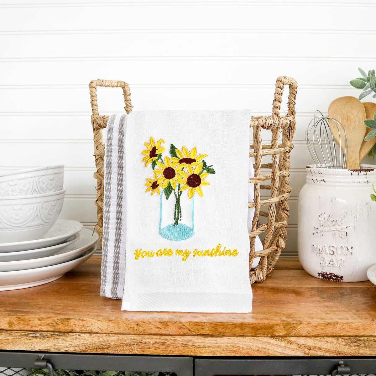 • Q: What is the design of the towels? A: The towels feature an embroidered design of sunflowers and a vase, along with the phrase 'you are my sunshine', adding a decorative touch.
