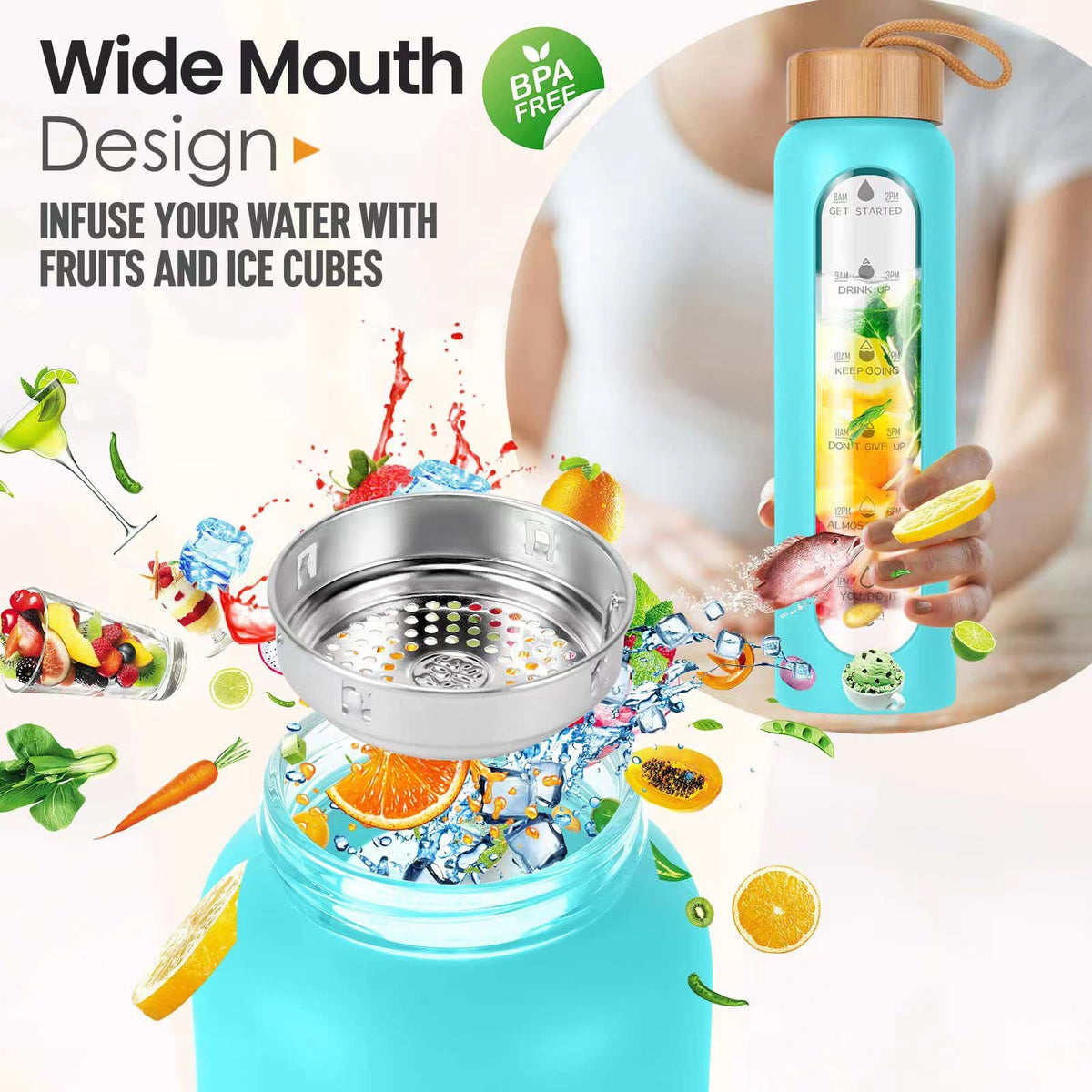 Aqulea 32 Oz Glass Water Bottle With Times To Drink - Bpa Free Reusable Wide Mouth Glass Motivational Water Bottles With Infuser