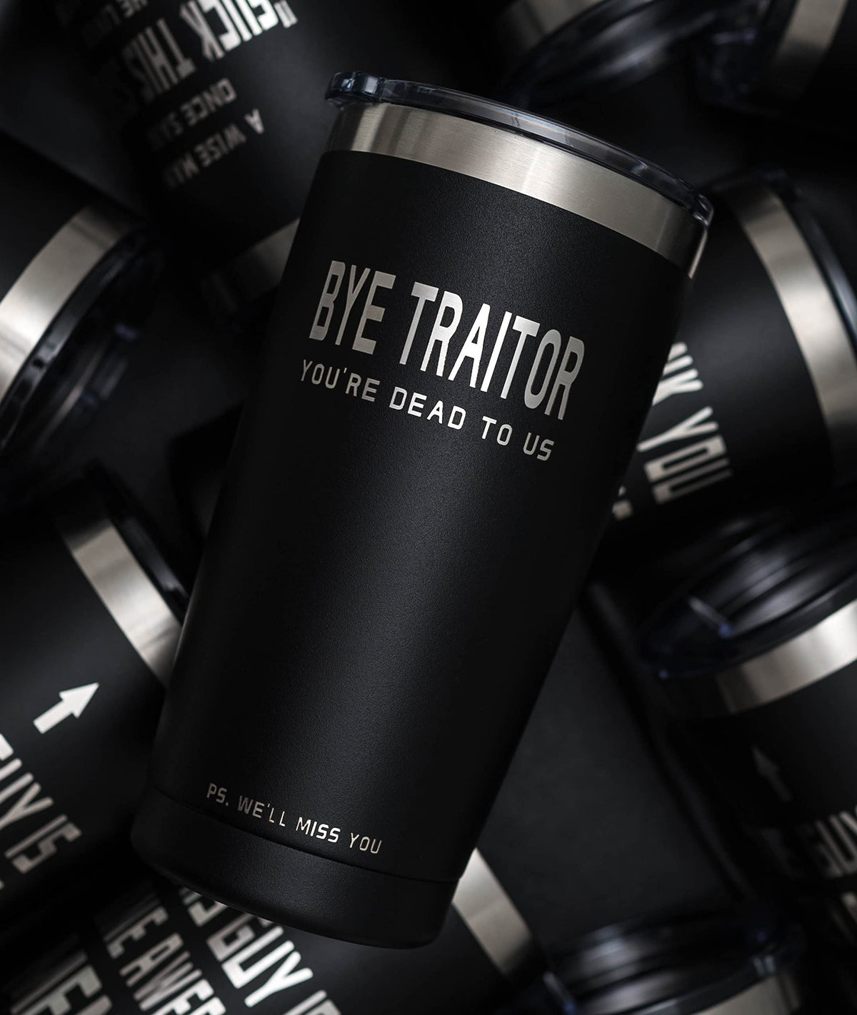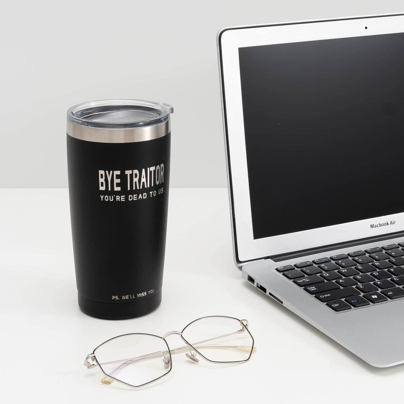 - Q: What is the design of the tumbler? A: The tumbler features a humorous engraving that says 'Bye Traitor You Are Dead To Us PS. We'll Miss You,' making it a fun farewell gift.