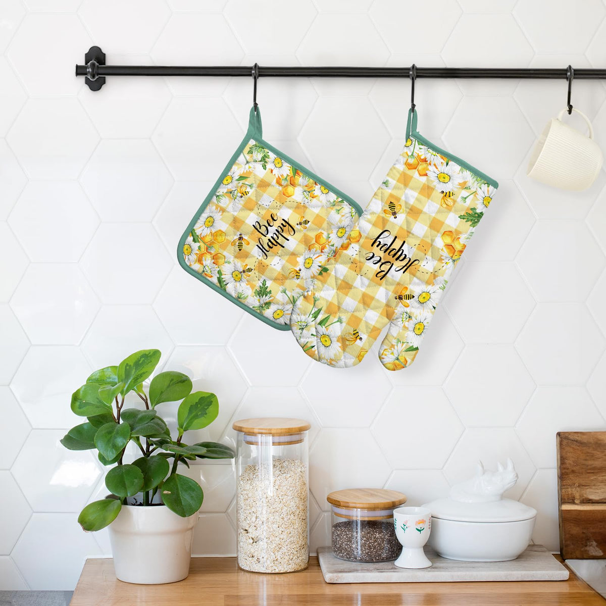 Arquiel Bee Daisy Oven Mitts And Pot Holders Sets 100% Cotton Heat Resistant, Extra Long Oven Gloves Potholder For Kitchen Cooki