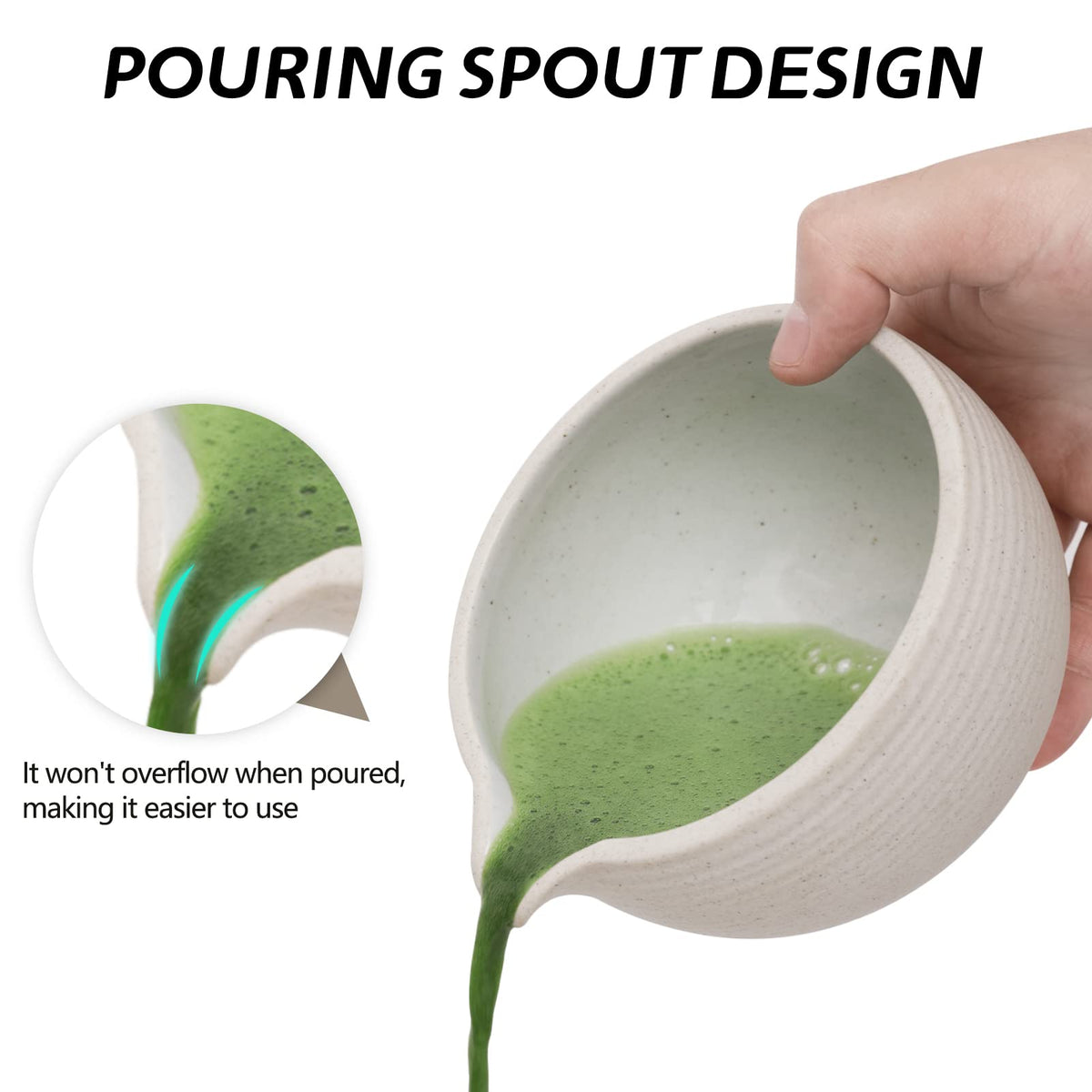 • Q: What is the purpose of the pouring spout design on the matcha bowl? A: The pouring spout design on the matcha bowl allows you to pour tea without spilling, making it easier to serve and enjoy matcha with family and friends.