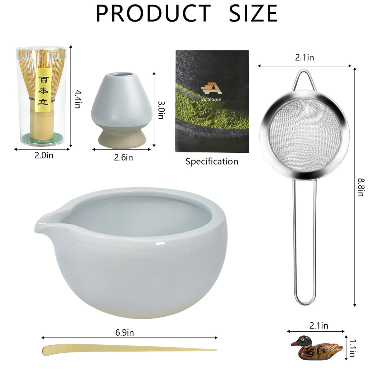 - Q: What is included in the Artcome Matcha Ceremony Kit? A: The Artcome Matcha Ceremony Kit includes a matcha bowl with a pouring spout, a matcha whisk, a whisk holder, a matcha powder strainer, a tea spoon, a tea scoop holder, and a matcha tea manual.
