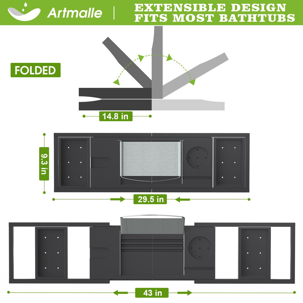 - Q: What are the dimensions of the bathtub caddy tray? A: The dimensions of the Artmalle Bathtub Caddy Tray can vary when expanded, but it is designed to comfortably fit on most bathtubs.