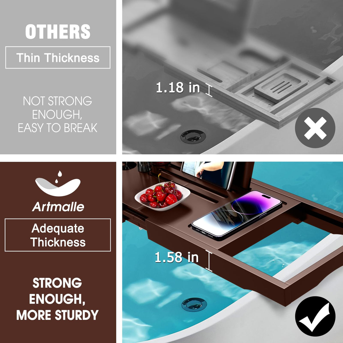 - Q: What is the size range of the Artmalle Bathtub Tray? A: The Artmalle Bathtub Tray expands from 27.6 inches to 39.2 inches, making it suitable for all standard Roman bathtubs.