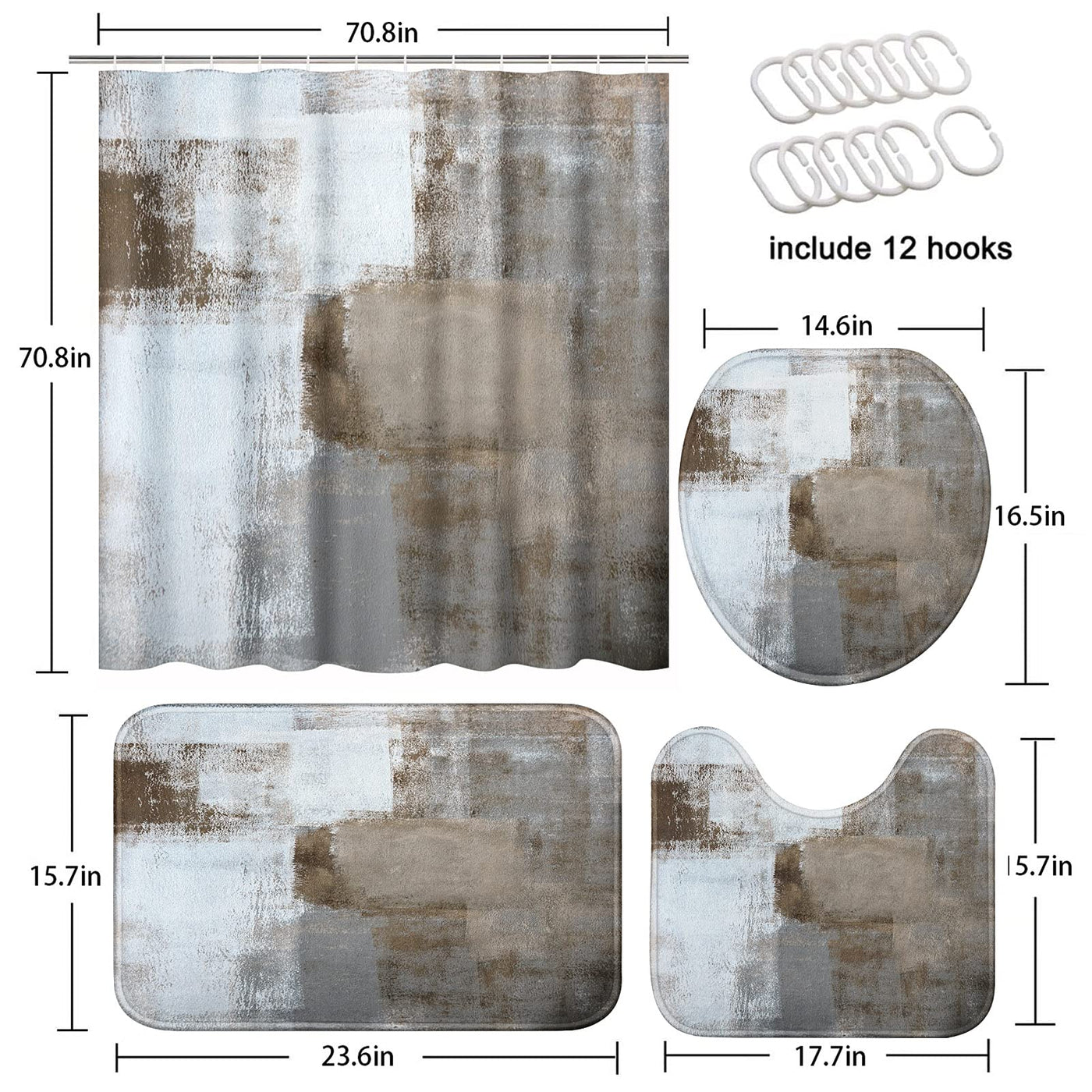 • Q: What sizes do the shower curtain and mats come in? A: The shower curtain measures 72 inches by 72 inches, the bathroom mat is 23.6 inches by 15.7 inches, the O-shaped toilet cover is 16.5 inches by 14.6 inches, and the U-shaped rug measures 17.7 inches by 15.8 inches.