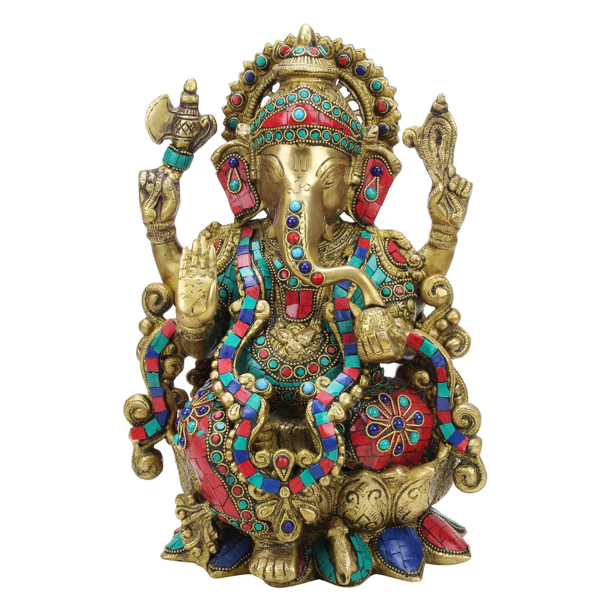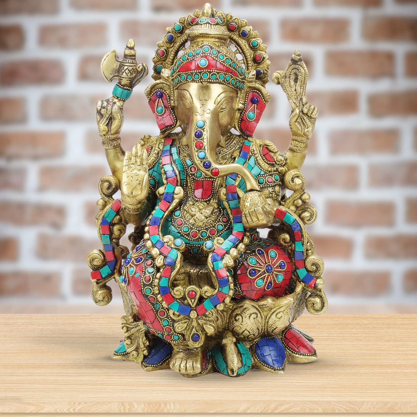 Artvarko Large Brass Ganesha Sitting On Lotus Flower Base Statue Ganesh Murti For Home Dcor Office Ganpati Idol 12 Inches