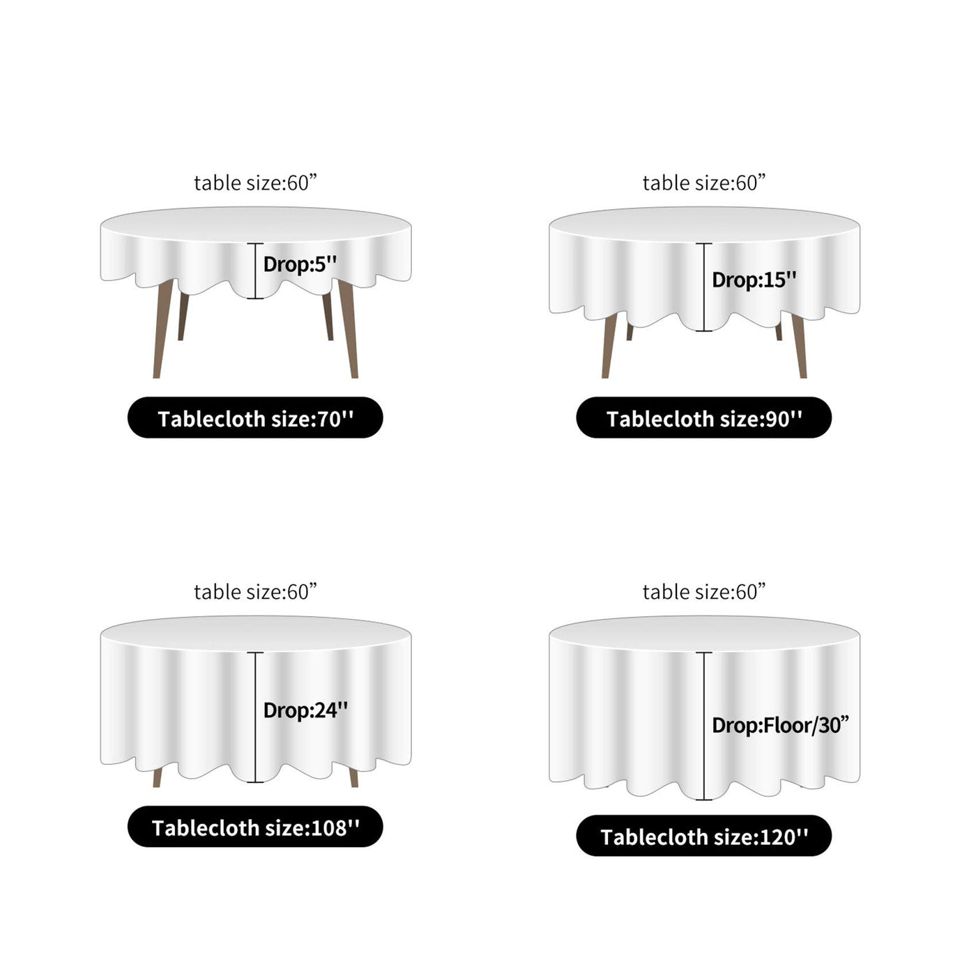 • Q: What size tables does this tablecloth fit? A: The 108-inch diameter tablecloth is suitable for both large and small tables, depending on your desired draping effect.
