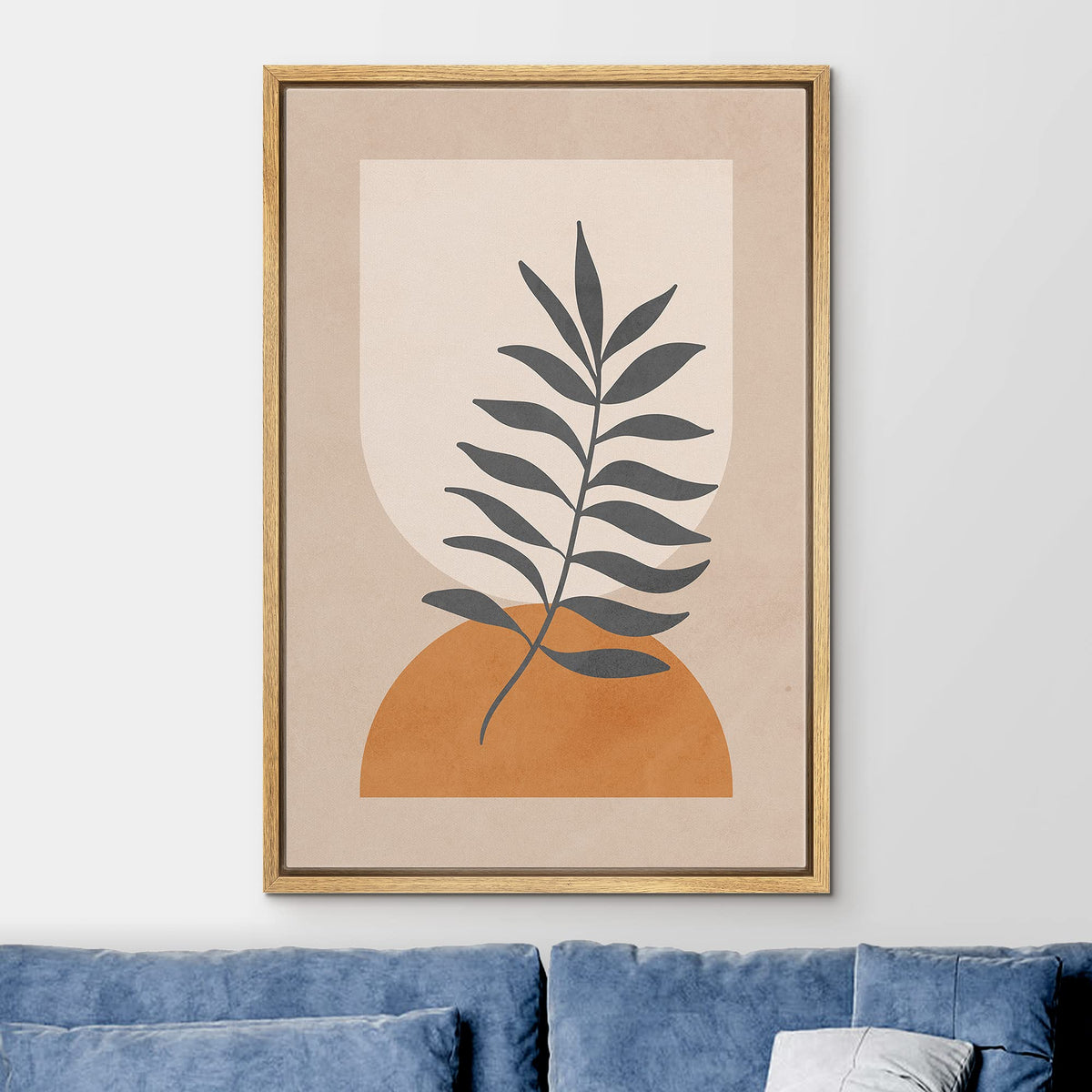 - Q: What style does the Ashbrook Framed Canvas Print represent? A: The Ashbrook Framed Canvas Print features a mid-century leaf silhouette design on an orange polygon background, reflecting a modern bohemian aesthetic.