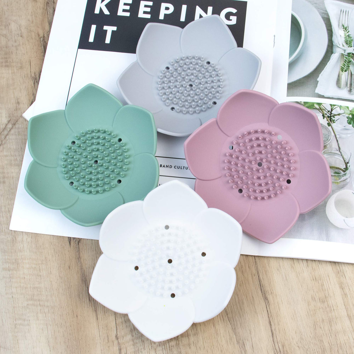 Auear, 4 Pack Lotus Flowers Soap Dish With Drain Silicone Holder Non-Slip Flexible Tray For Bathroom Shower