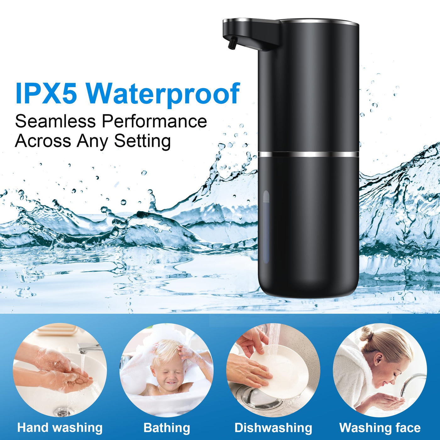 • Q: Is the soap dispenser waterproof? A: Yes, the dispenser features IPX5 water-resistant technology which protects the battery compartment from soap and water, enhancing its durability.